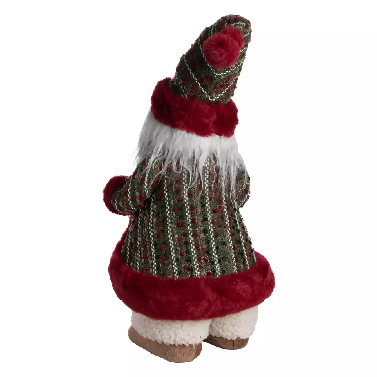Фігурка виконана з м’яких матеріалів, що створюють затишний зимовий образ. Санта має довгу білу бороду, круглий ніс і червоно-зелений ковпак з помпоном. Його пальто — зелене з червоними манжетами. Штани — кремові, з пухнастою текстурою, взуття — коричневе. Всі елементи гармонійно поєднані, передаючи скандинавський стиль без надмірного декору. Вага 200 г забезпечує стійкість фігурки.