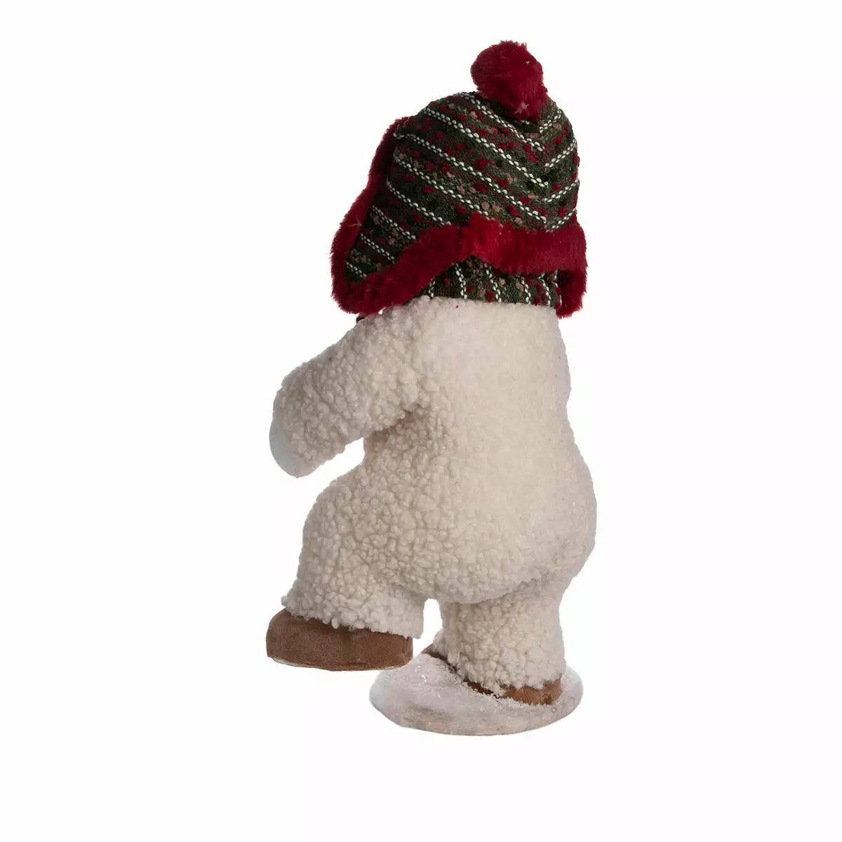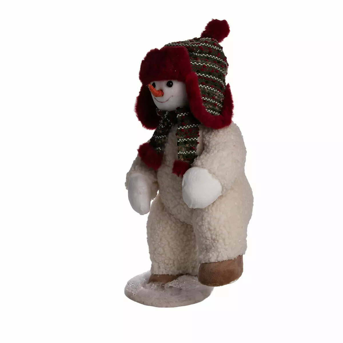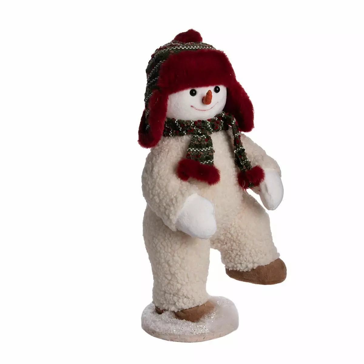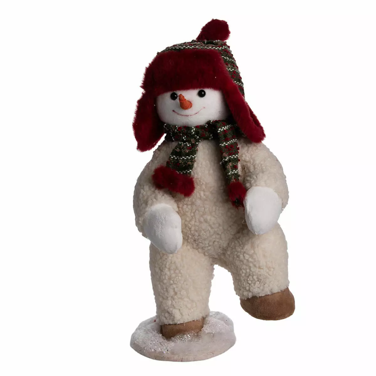 Фігурка виконана з м’якого білого матеріалу з текстурою. Сніговик має усміхнене обличчя з чорними очима та морквяним носом. Одягнений у червоно-зелений шарф у клітинку та червону шапку з вушками, оздоблену зеленими вставками. Взуття — коричневе, текстильне. Загальна вага — 300 г, що забезпечує легкість у переміщенні та стабільність при встановленні.