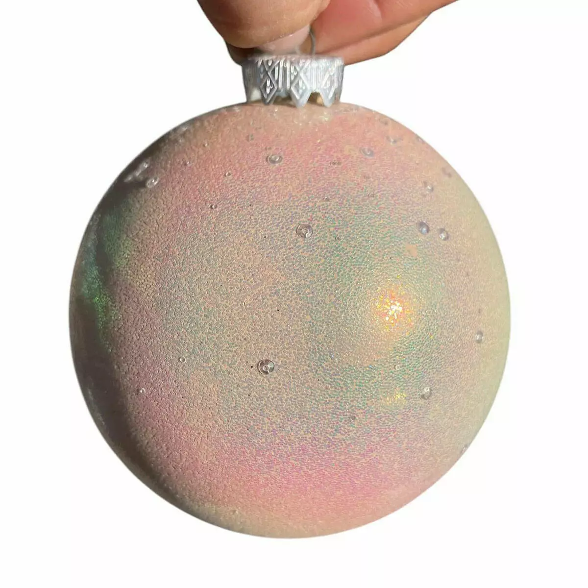 Новорічна куля на ялинку 120 мм, глянець, пудровий — це декоративний елемент, який можна застосувати як для домашньої ялинки, так і для оформлення публічних просторів. Пудровий колір має м’який перехід із рожевими та зеленуватими відтінками, які змінюються залежно від кута освітлення. Такий ефект додає зорової глибини без надмірної яскравості.