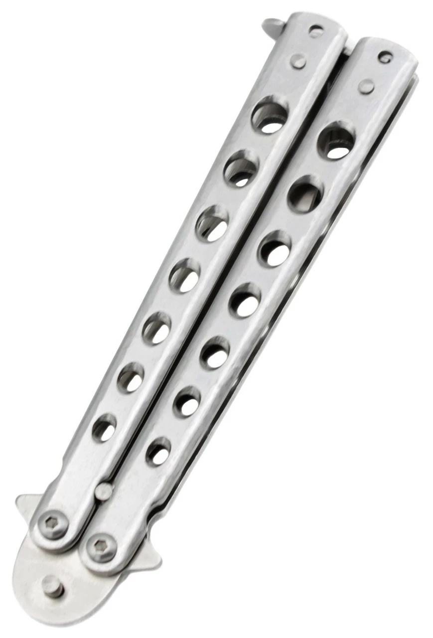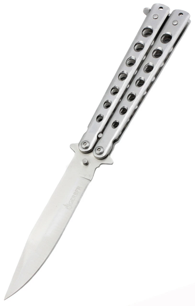 двухсторонняя. Есть предохранитель. Размер ножа-бабочки 22.5 см.