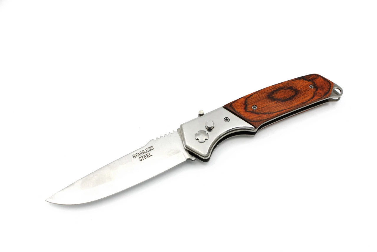 Универсальный выкидной нож. Ручка из стали со вставками дерева.