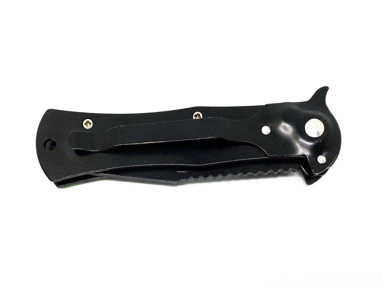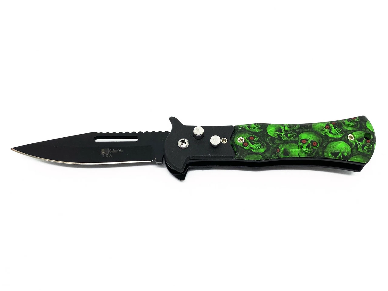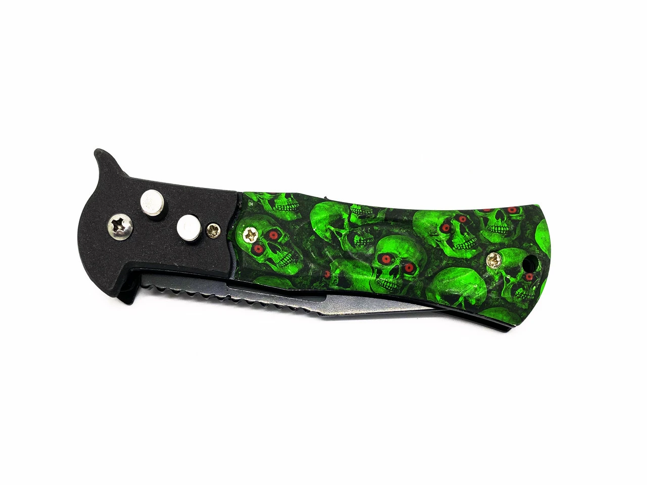Рукоятка - зелёная пластик с черепами с одной стороны, метал с