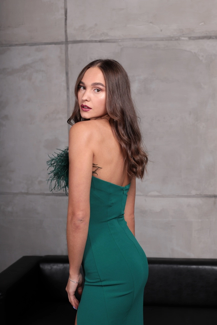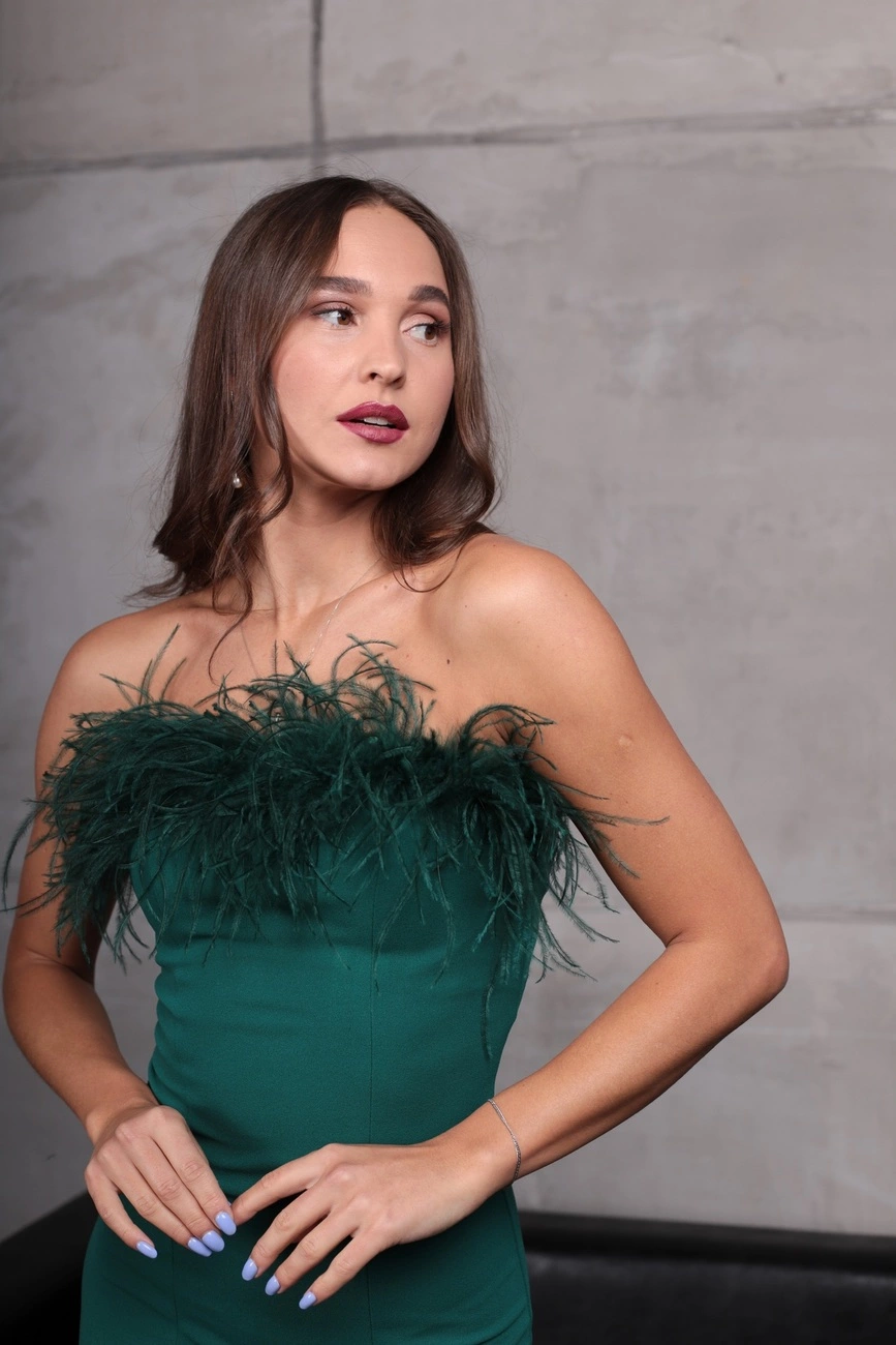 Облегающее вечернее платье с перьями страуса