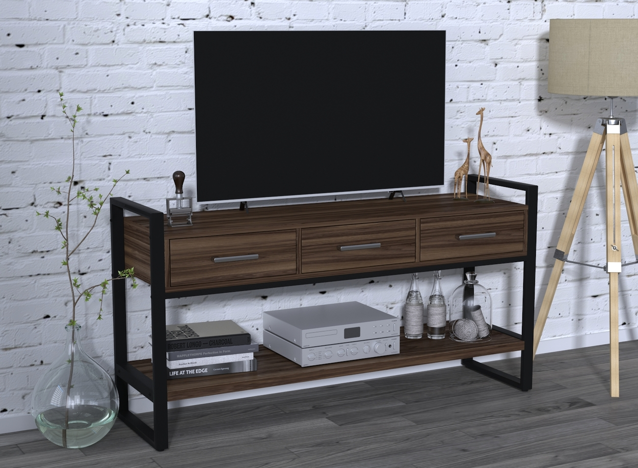 Внешне консоль напоминает низкий стеллаж. Строгая геометрия форм компенсируется добротностью металла и благородной текстурой ДСП.