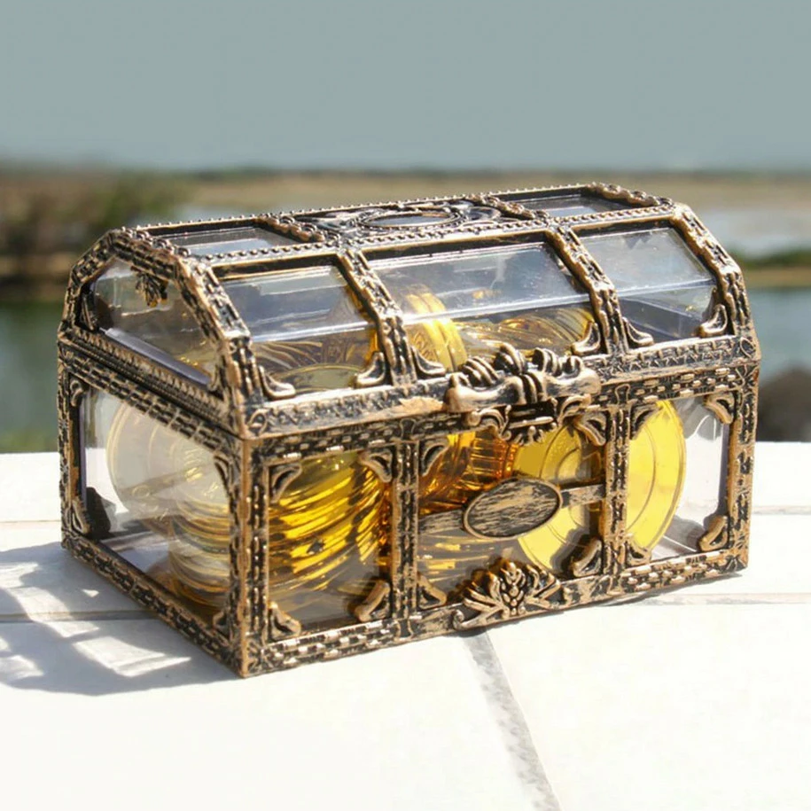 Скринька для ювелірних виробів виконана з якісного пластику, зроблена під старовину у вигляді піратської скрині скарбів. Скринька прозора. Усередині скриньки одне відділення. Підходить для зберігання сережок, кілець, ланцюжків тощо.