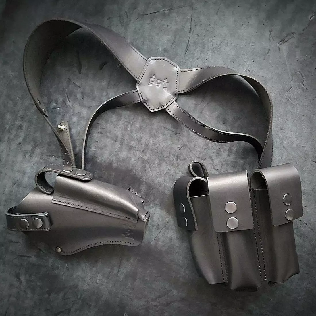 Кобура з магазином зліва, додаткові магазини справа. Знімаються з наплічної системи і можна носити на ремені шириною 5 см.