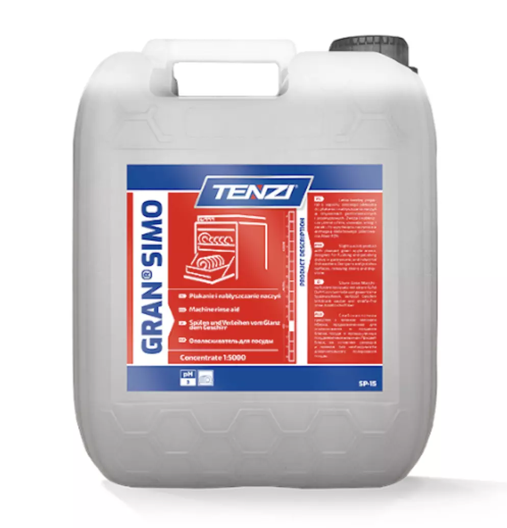 Запобігає утворенню розводів і плям на посуді, надає блиск.