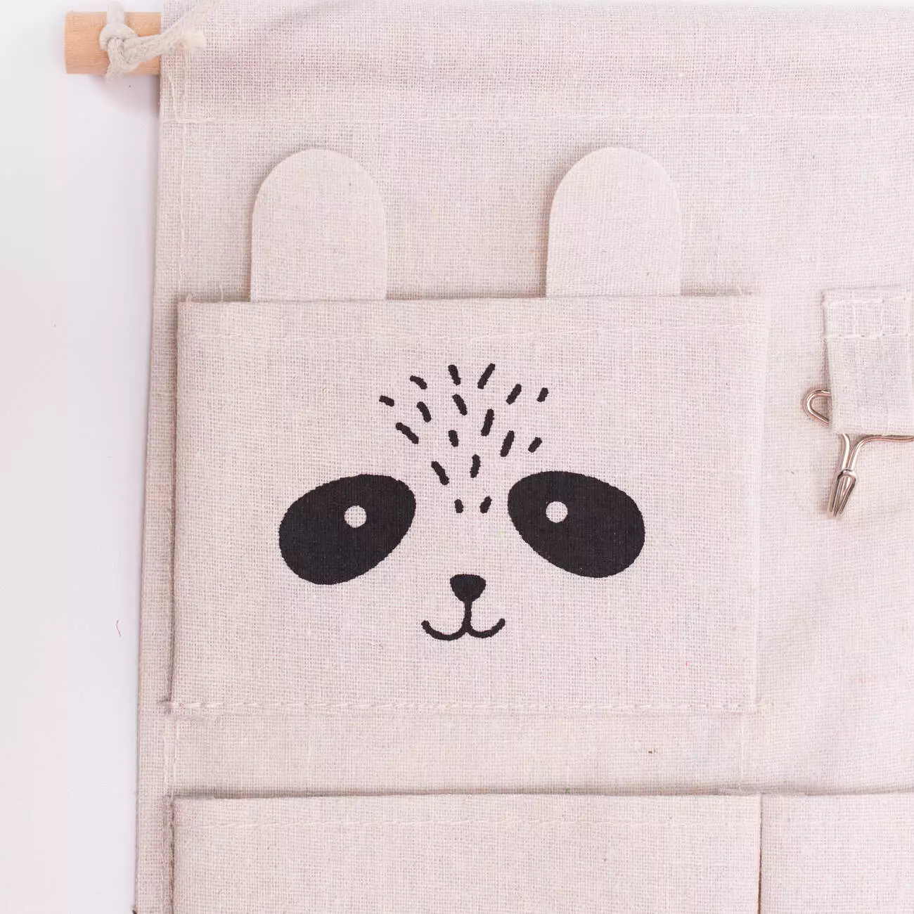 Три окремі секції дозволяють зберігати ключі, канцелярію, косметику чи інші дрібні предмети. Додатково передбачені гачки для зручного розміщення речей, які варто тримати під рукою. Конструкція має міцну мотузку для підвішування, а яскравий дизайн із ведмедиком додає виробу привабливості, особливо для дитячої кімнати.