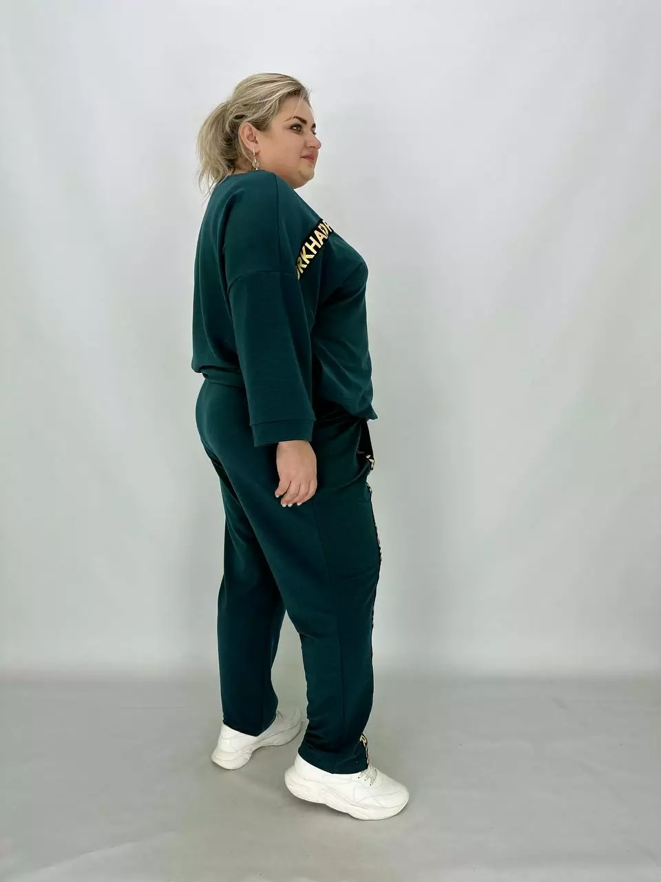 Прогулянковий костюм із двонитки, відмінної якості з гарною розтяжністю, прикрашений пришивною стрічкою з нанесенням з фольга. Кофта-вільний крій зі спущеним плечем, низ регулюється гумками з фіксатором, кишені в бічних швах, горловина човник. Штани-посадка висока, пояс на гумці, з кишенями, по переду закладені зустрічні складки, до низу звужені