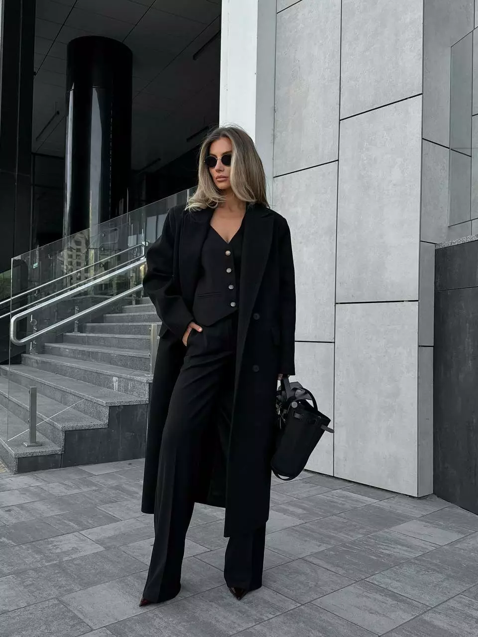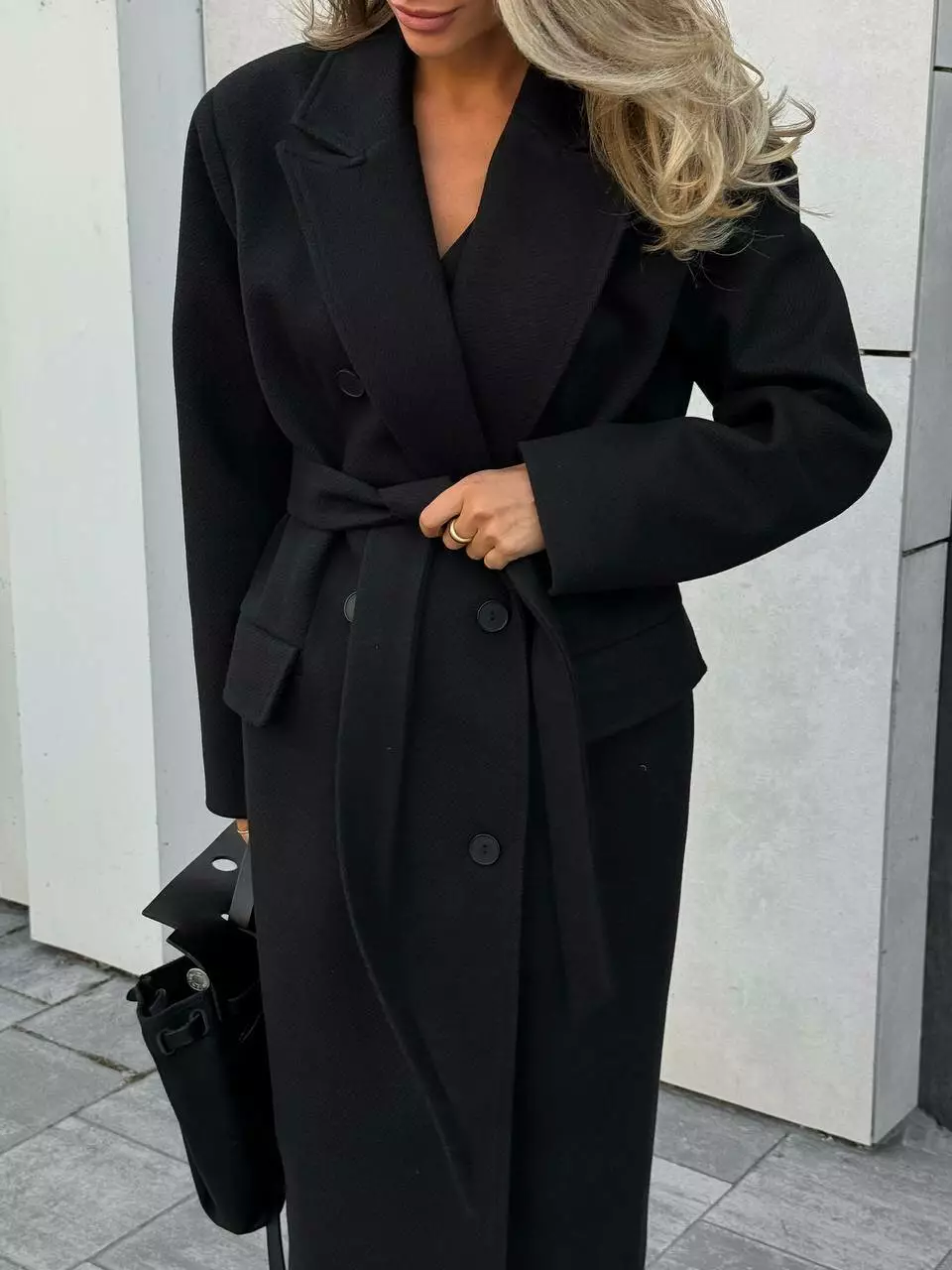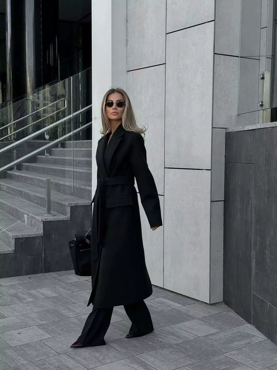 Трендове подовжене двобортне пальто класичного крою з об'ємними плечима Дизайн пальто створений, щоб відчувати себе неймовірно комфортно та впевнено у будь-якій ситуації, 2 діючі кишені та шліца по спинці внизу Застібається на гудзики, пояс в комплекті