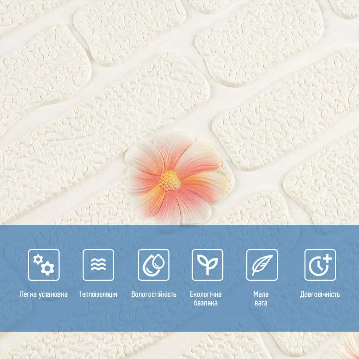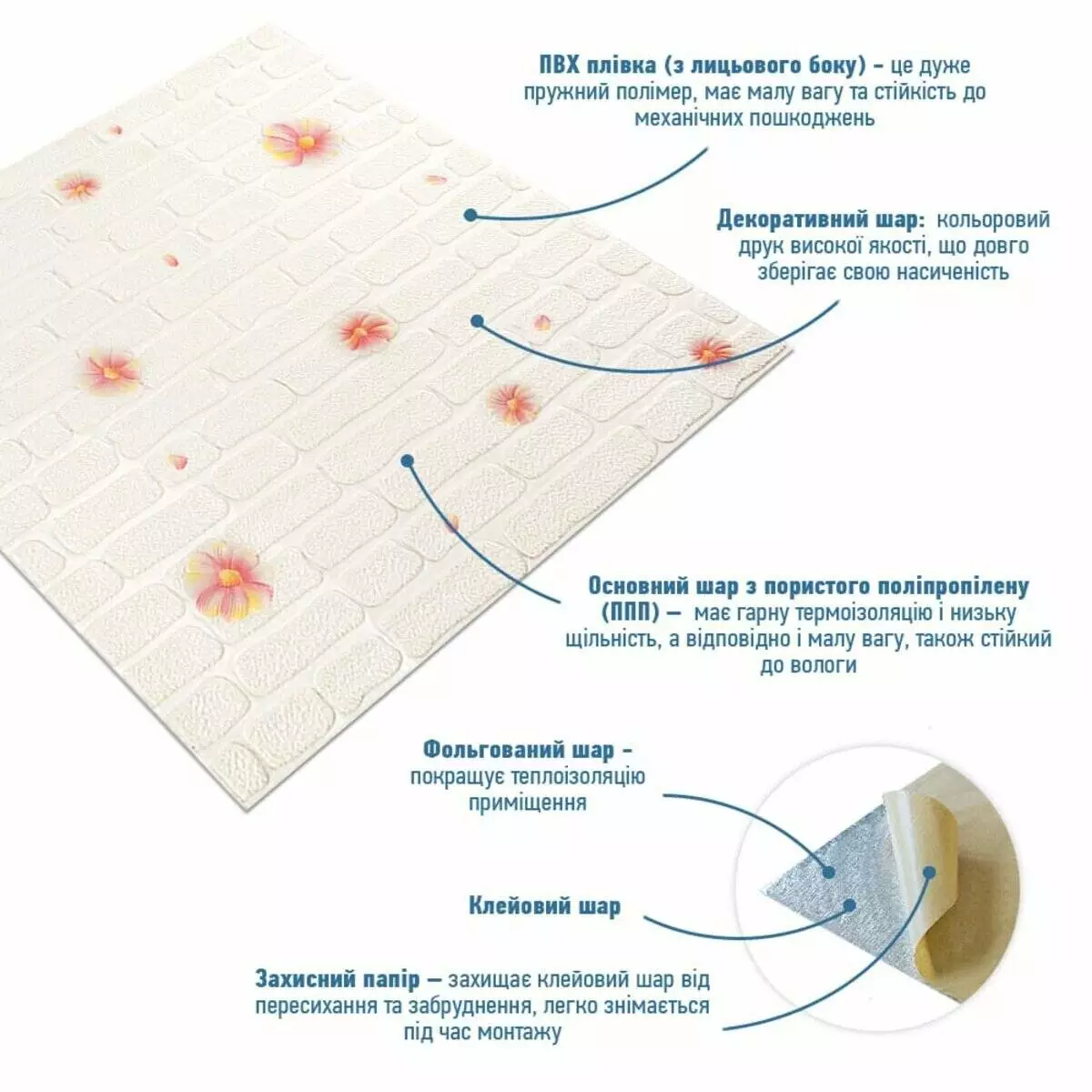 3D панелі самоклеючі – декоративне покриття для стін, виконане з легкого та міцного матеріалу – пористого поліпропілену (ППП). Основна особливість – рельєфний малюнок у вигляді цегли у широкому різноманітті кольорів та наявність клейового шару, що дозволяє встановити панелі без необхідності застосування додаткових матеріалів.