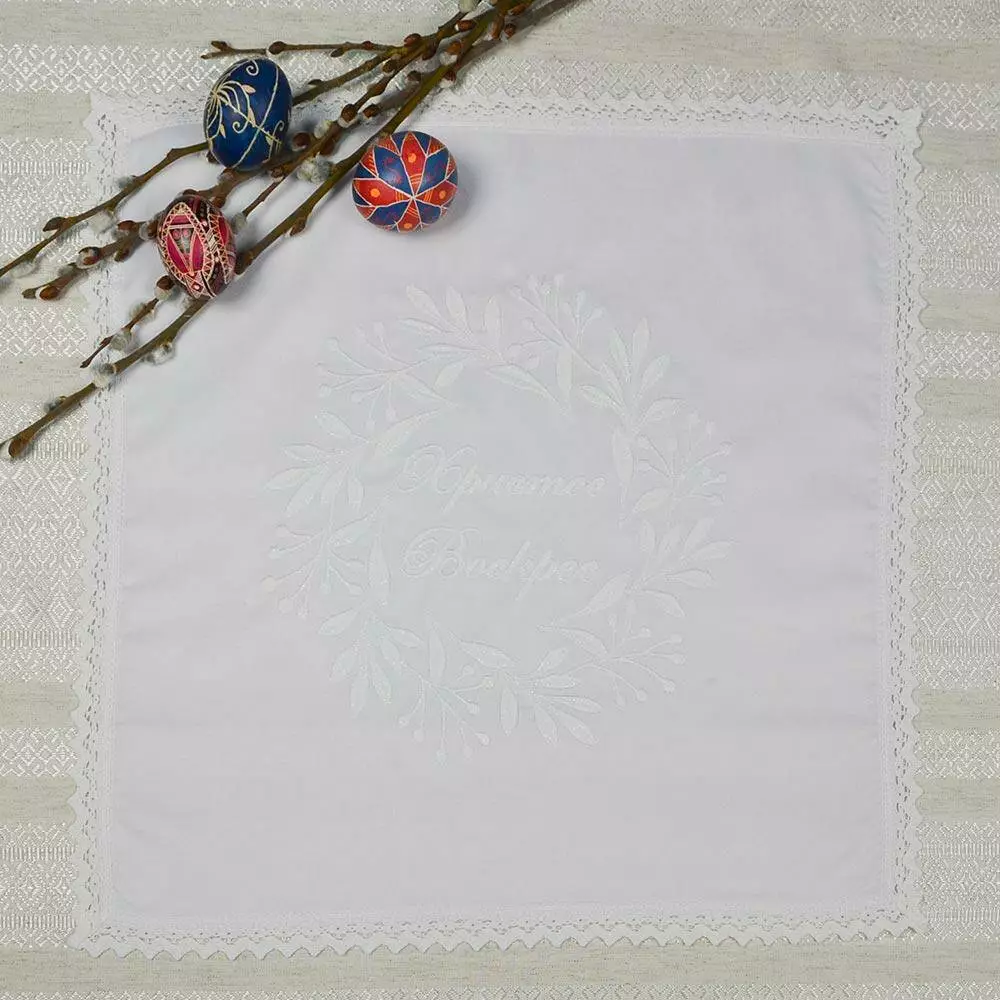 Столешня великодня прикрасить ваш святковий стіл. В основі щільне полотно, обшите якісним мереживом. Посередині машинна вишивка гладдю.