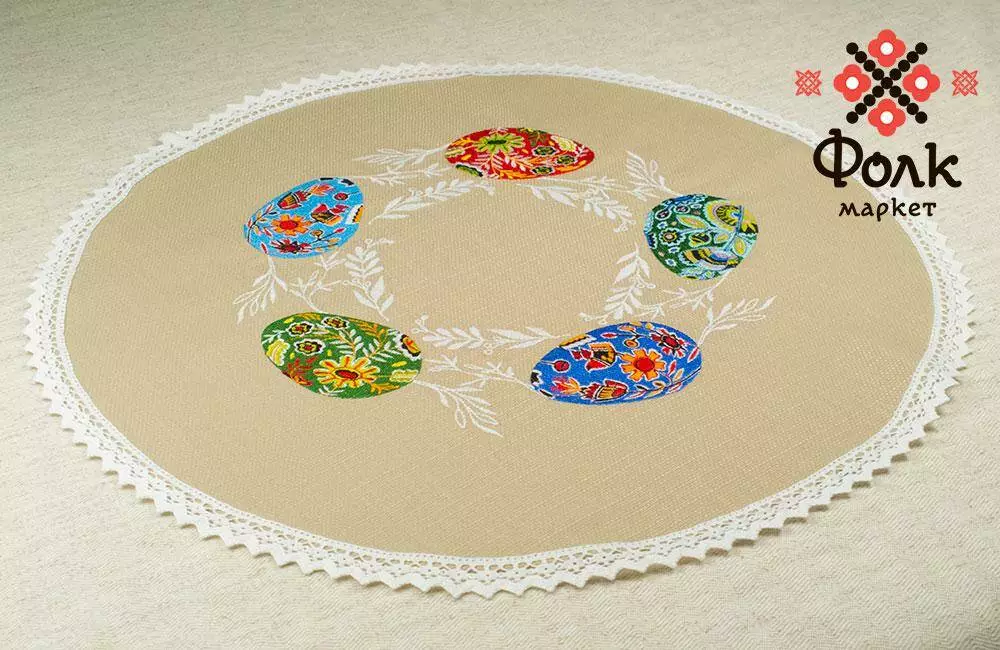 Столешня великодня прикрасить ваш святковий стіл. В основі щільне полотно, обшите якісним мереживом. Посередині машинна вишивка гладдю.