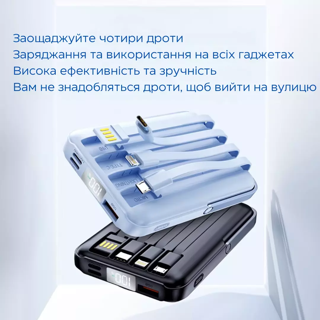 Powerbank оснащён универсальными встроенными кабелями Type-C,