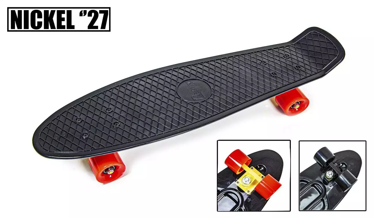 <p>Одна из самых прочных и быстрых моделей пенни, на которой с легкостью может разместиться даже мужчина с большим весом и размером ноги. В этой модели совмещен классический дизайн и повышенные характеристики: длина деки 70 см (в стандартном пенни она составляет 55 см. См.фото) - Вам гарантировано устойчивое положение и полная уверенность в себе. <strong>Пенниборд Nickel 27"</strong> в черном цвете станет отличным снарядом для великолепных городских "покатушек". Подходит как взрослым, так и подросткам.</p><br /> <p>Описание и преимущества Пенниборда "Nickel 27" :</p><br /> <ul><br /> <li>торговая марка "Nickel";</li><br /> <li>прочный пластик в основе доски - добротность и легкость;</li><br /> <li>антискользящая поверхность - устойчивость, безопасность и отличное сцепление;</li><br /> <li>оптимальные габариты: 70 на 19 см.;</li><br /> <li>прочная металлическая подвеска и надежные подшипники ABEC-7 - хорошо выдерживают нагрузку;</li><br /> <li>красные PU-колеса из полиуретана;</li><br /> <li>предельная нагрузка - 90 кг.;</li><br /> <li>стильная расцветка - черная дека и красные колеса .</li><br /> </ul><br /> <p>Купить Пенниборд "Nickel 27" и подарить самый модный спортивный скейт для быстрых и веселых гонок</p><br /> <p>Ловкие прыжки и самые сложные трюки выполнять теперь очень легко - <strong>покупая Пенниборды "Nickel 27" по цене</strong> производителя, Вы получаете отменное качество с наименьшими затратами. Добавим к этому невероятно удобный способ приобретения - через интернет-магазин, и удовольствие от покупки возрастает. Вам нужно только оформить заказ, указав место своего пребывания, и уже через 1-2 дня получить свой товар на руки.</p><br />