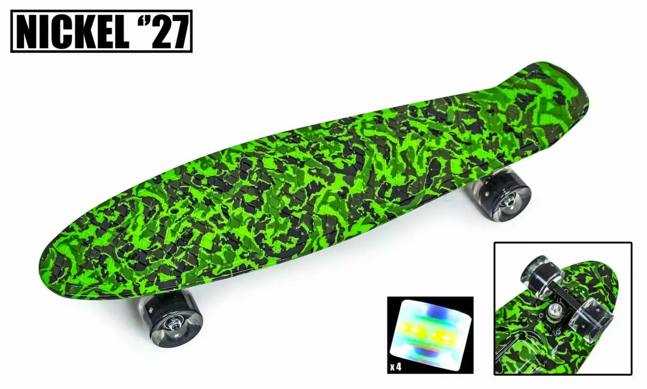 <p>Новинка! Penny Board Nickel 27" Military на sportdrive.com.ua В этой модели совмещен современный дизайн и повышенные характеристики: длина деки 70 см (в стандартном пенни она составляет 55 см). Вам гарантировано устойчивое положение и полная уверенность в себе. <strong>Пенниборд Nickel 27"</strong> в черном цвете станет отличным снарядом для великолепных городских "покатушек". Подходит как взрослым, так и подросткам.</p><br /> <p>Описание и преимущества Пенниборда "Nickel 27 Military" :</p><br /> <ul><br /> <li>торговая марка "Nickel";</li><br /> <li>прочный пластик в основе доски - добротность и легкость;</li><br /> <li>антискользящая поверхность - устойчивость, безопасность и отличное сцепление;</li><br /> <li>оптимальные габариты: 70 на 19 см.;</li><br /> <li>прочная металлическая подвеска и надежные подшипники ABEC-7 - хорошо выдерживают нагрузку;</li><br /> <li>черные PU-колеса из полиуретана;</li><br /> <li>предельная нагрузка - 90 кг.;</li><br /> <li>стильная расцветка - зеленый камуфлях .</li><br /> </ul><br /> <p>Купить Пенниборд "Nickel 27 Military" и подарить самый модный спортивный скейт для быстрых и веселых гонок</p><br /> <p>Ловкие прыжки и самые сложные трюки выполнять теперь очень легко - <strong>покупая Пенниборды "Nickel 27 Military" по цене</strong> производителя, Вы получаете отменное качество с наименьшими затратами. Добавим к этому невероятно удобный способ приобретения - через интернет-магазин, и удовольствие от покупки возрастает. Вам нужно только оформить заказ, указав место своего пребывания, и уже через 1-2 дня получить свой товар на руки.</p><br />