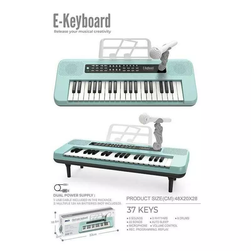 Синтезатор 328-71 (24) мікрофон, 37 клавіш, працює від мережі або батарейок, звук, мелодії, 2 AUX-роз`єми, USB-type-c кабель, в коробці