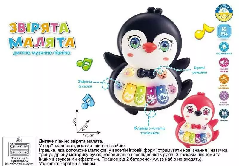 Піаніно 85270 (120/2) "WToys", "ПІНГВІН", 2 кольори, УКРАЇНСЬКЕ ОЗВУЧУВАННЯ, ноти, мелодії, пісні, казки, світло, цифри, звуки тварин, в коробці