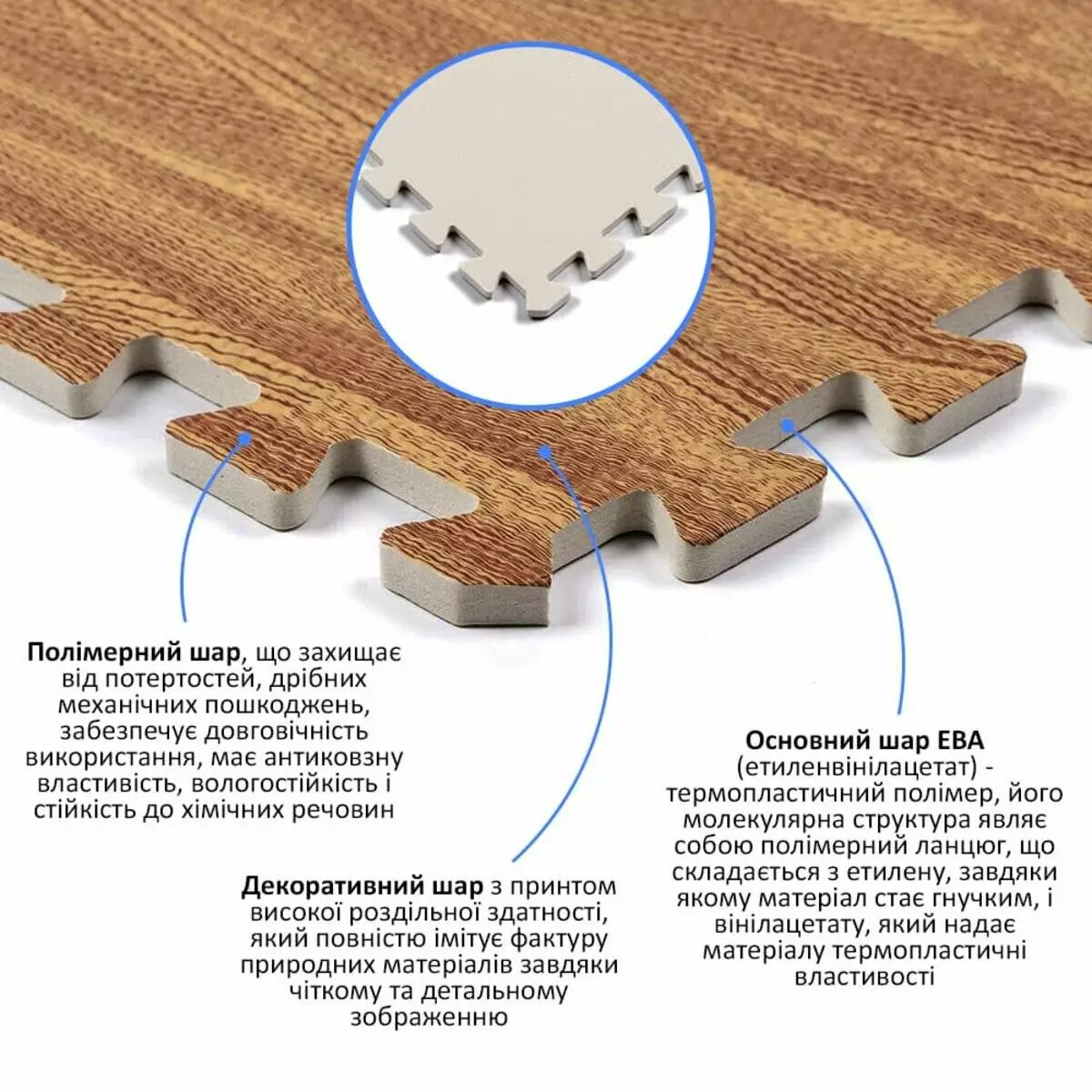 Покриття підлогове модульне «Пазл» являє собою модульні плити з вирізаними замками, які легко з'єднуються між собою, утворюючи стійке і міцне покриття. Замки знімаються. Ключові характеристики підлогового покриття: