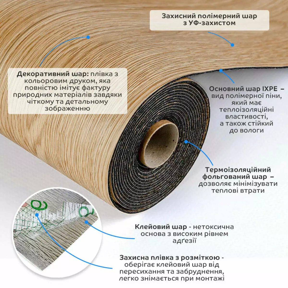 - Легкий монтаж: клейовий шар робить процес укладання швидким і