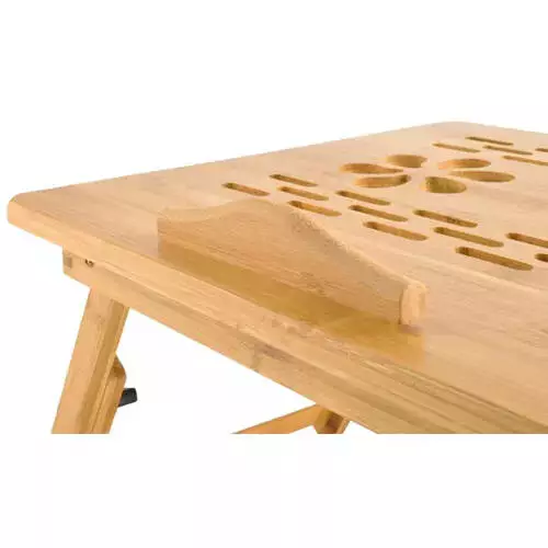 Зручний і практичний стіл для ноутбука з вентиляцією - це аксесуар, який оцінить кожен, хто любить працювати за комп'ютером в зручній, невимушеній позі. На жаль, використання ноутбука в ліжку або на дивані часто передбачає тримання його на колінах, що не тільки незручно, але й може призвести до перегріву пристрою. Бамбуковий столик для ноутбука чудово підійде як у ліжку, так і на дивані, а також у літаку, поїзді та автобусі. Завдяки отворам у стільниці ви легко можете накритися улюбленою ковдрою і поставити комп'ютер або планшет на вентильований столик для ноутбука - він точно не перегріється. Отвори в стільниці розсіюють тепло, завдяки чому батарея комп’ютера працюватиме довше.