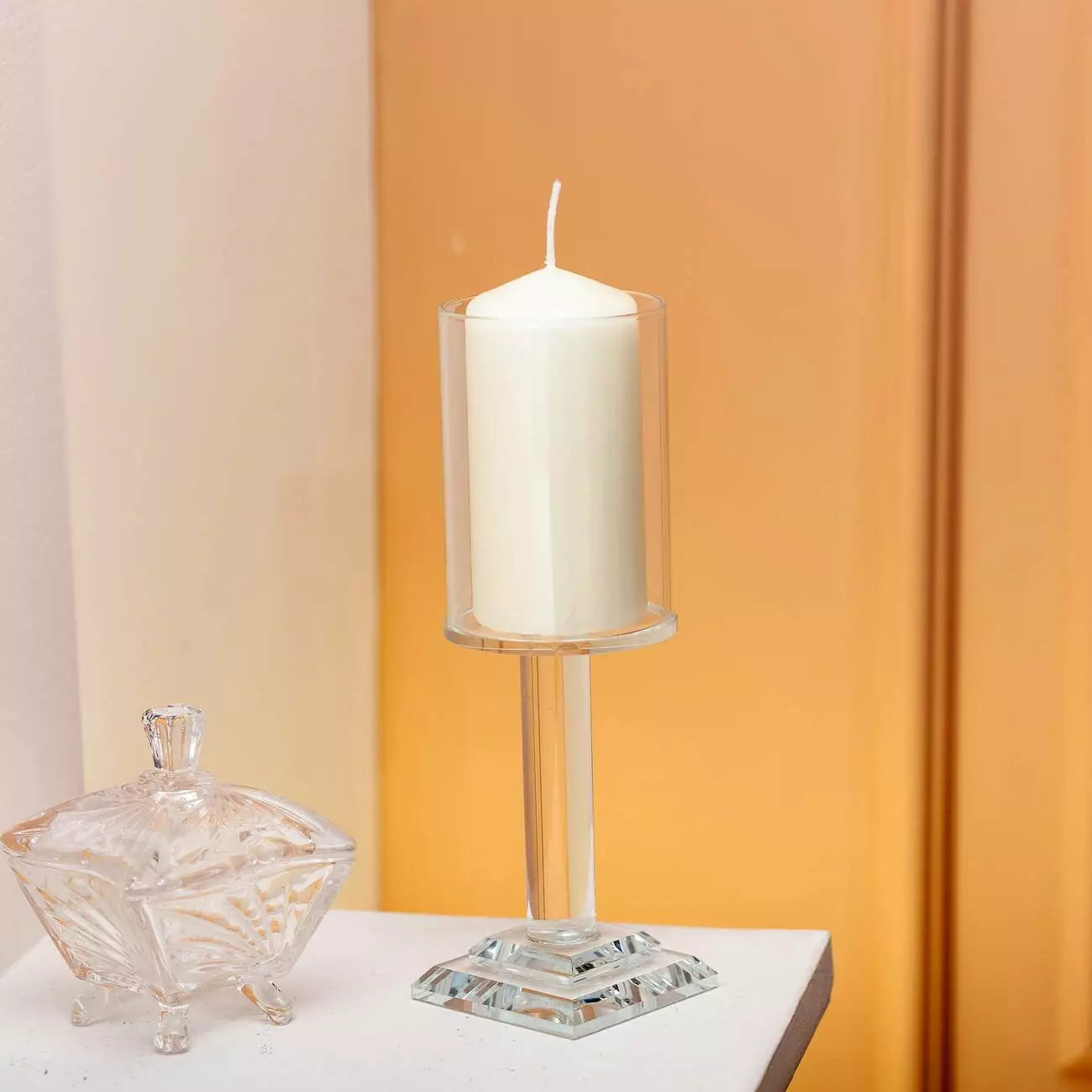 Матеріал підсвічника — прозоре гладке скло з глянцевою поверхнею. Квадратна основа надає додаткову стійкість та візуально підкреслює вертикальність виробу. Скляна конструкція добре пропускає світло, даючи змогу повністю відкрити вигляд на полум’я. Підходить для оформлення святкових столів, камінних полиць, підвіконь і декоративних композицій.