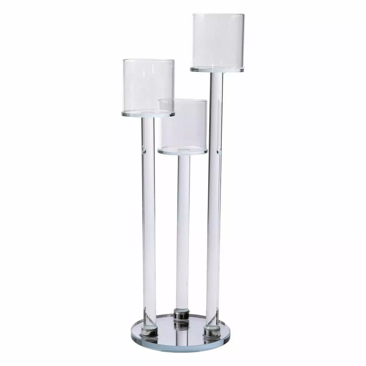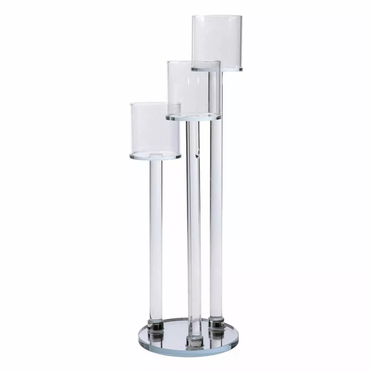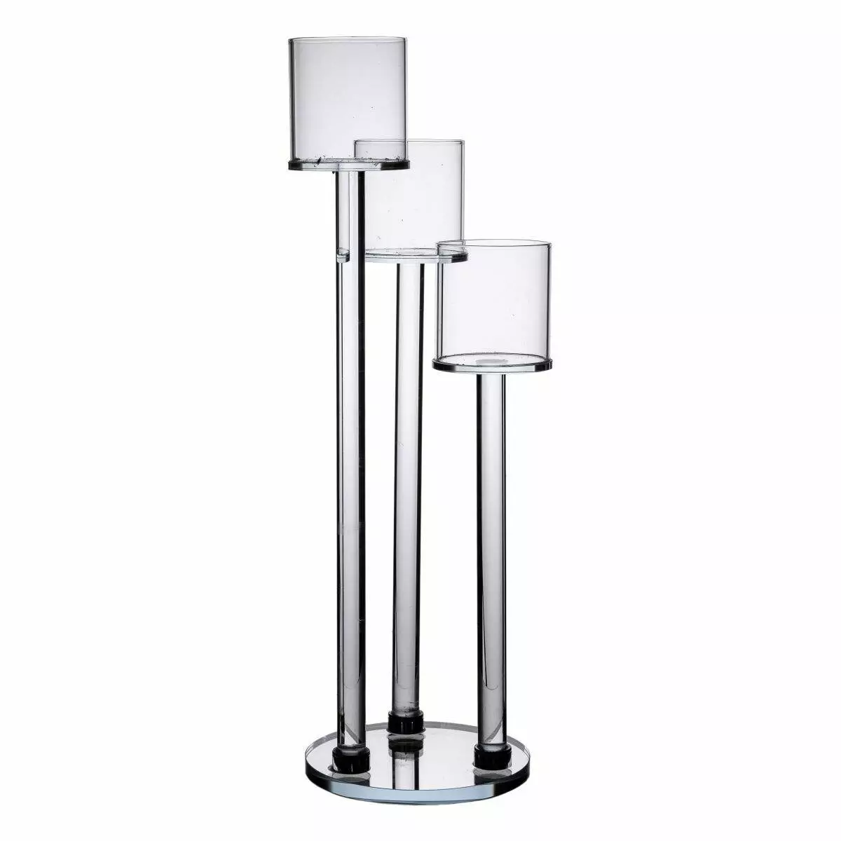 Прозорий скляний підсвічник на 3 свічки створений для симетричного й вертикального розміщення свічок різної висоти. Конструкція складається з трьох трубчастих стійок, розміщених на круглій основі, що забезпечує стабільність. Верхня частина кожної стійки має циліндричний тримач діаметром 5,5 см, що підходить для стандартних товстих свічок. Різна висота тримачів дозволяє створити об’ємну композицію зі свічок.