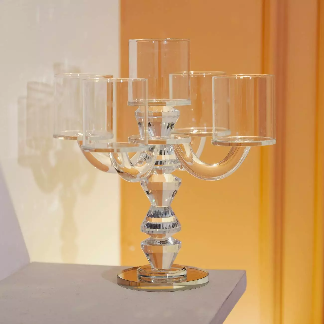 Скляний підсвічник Flora розрахований на п'ять свічок і виконаний у формі класичного канделябра з декоративними елементами. Верхня частина має пряму лінійну конструкцію з п'ятьма тримачами діаметром 5.5 см, придатними для широких циліндричних свічок. Геометрична основа забезпечує рівновагу й візуально підкреслює стиль канделябра.