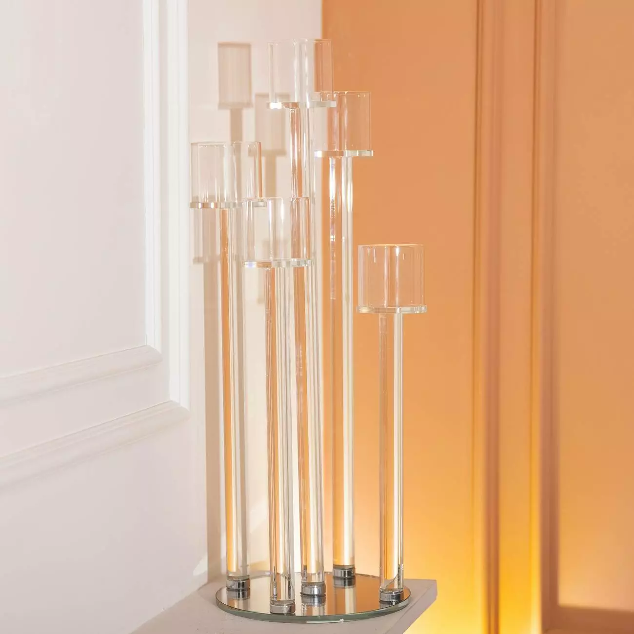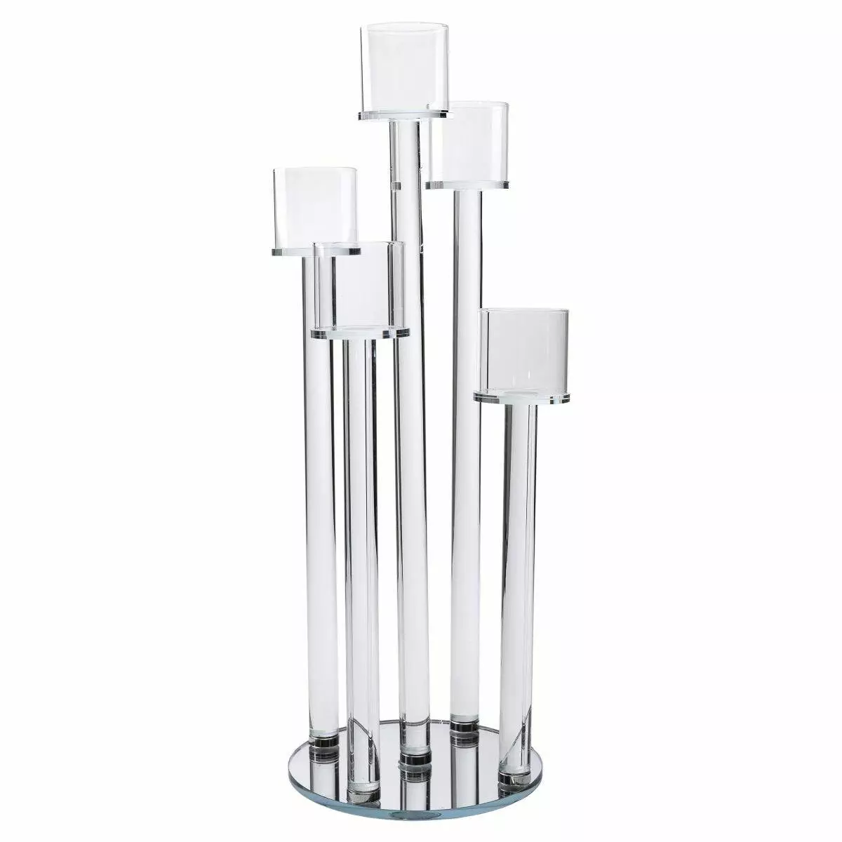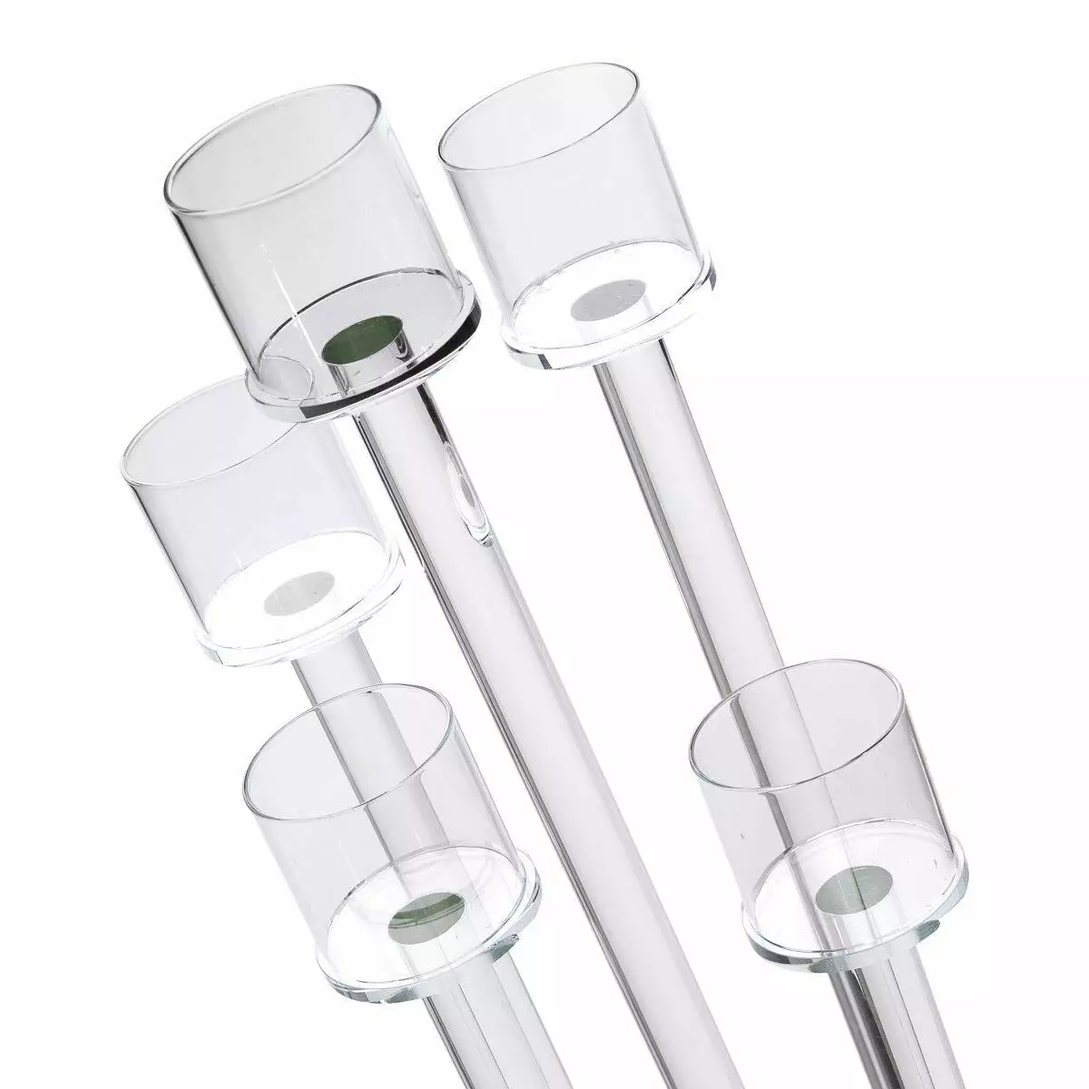 Скляний підсвічник з п'ятьма свічниками різної висоти призначений для вертикального розміщення об'ємних свічок. Виріб складається з п'яти трубчастих ніжок, кожна з яких завершується циліндричним тримачем діаметром 6 см. Основу діаметром 20 см виконано з прозорого скла, що забезпечує стабільність конструкції навіть при максимальній висоті.