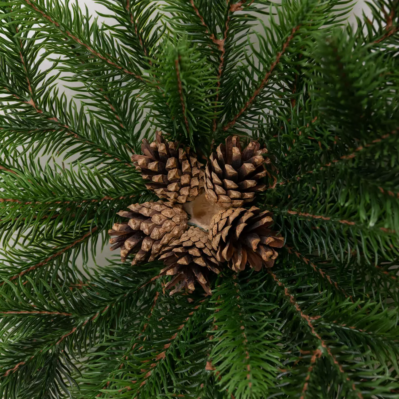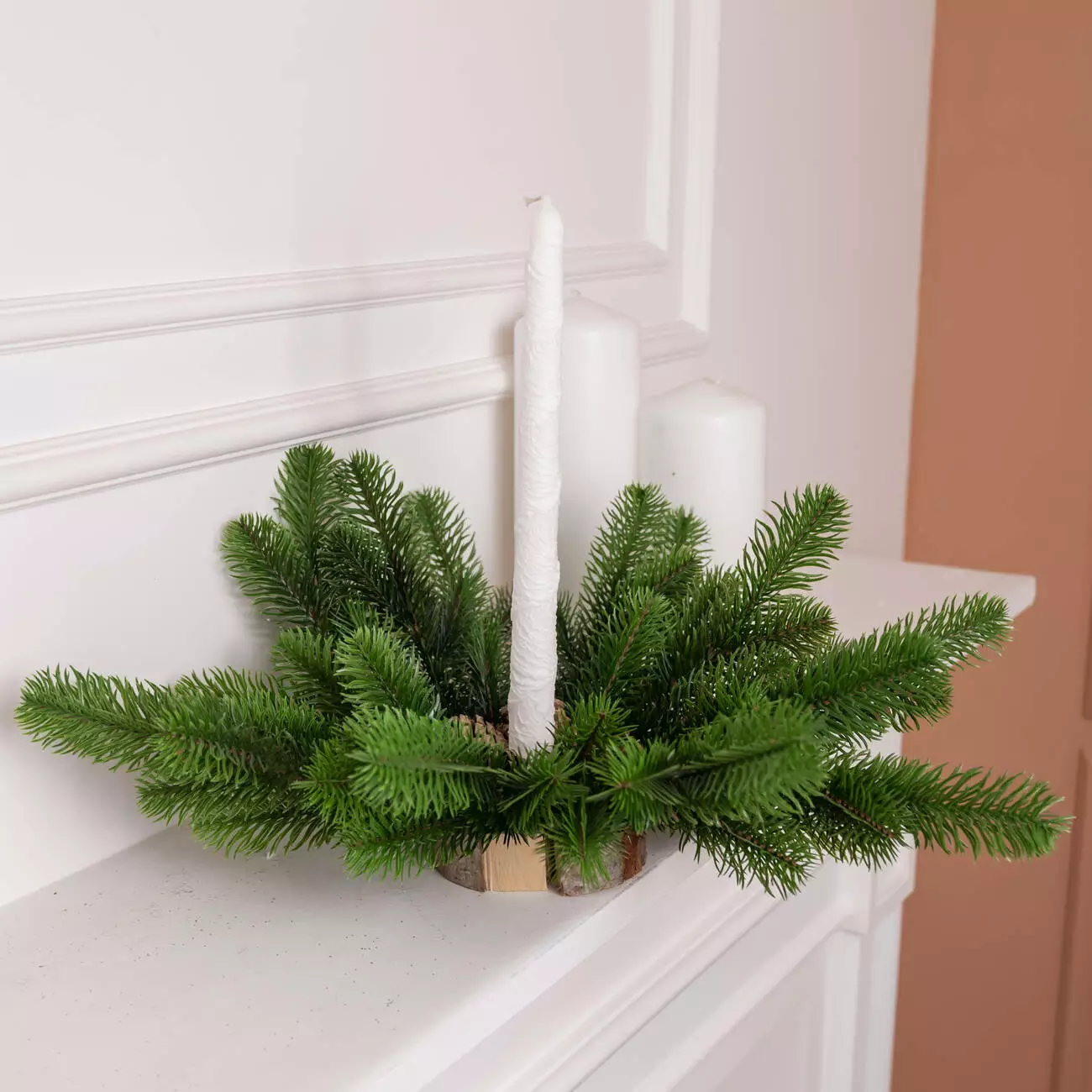 Підсвічник-вінок на 1 свічку «Делюкс» — це гармонійне поєднання натурального вигляду та практичності. Композиція виконана з литих гілок, які імітують ялинові пагони, доповнених декоративними шишками. Завдяки густому об’єму зеленої хвої виріб має природний вигляд і створює відчуття свіжості.