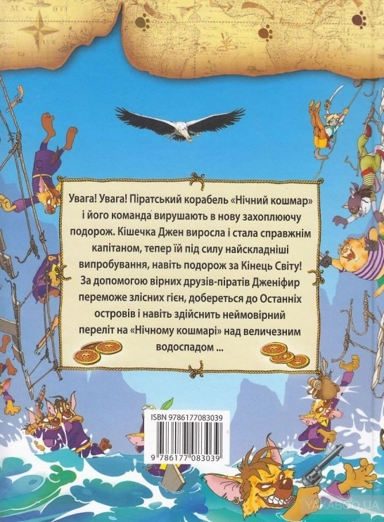 Автор: Аня Амасова Видавництво:Сім кольорів Серія книг: Морські пригоди Мова:Українська Перекладач:Тетяна Щегельська Вік:6+ Ілюстратор:Віктор Запаренко Кількість сторінок:192 Ілюстрації:Кольорові Формат:60х84/16 (~145х210 мм) Палітурка:Тверда Папір:Офсетний ISBN:978-617-7083-10-7, 978-966-2054-46-0 Вага:190 гр. Тип:Паперова Література за періодами: Сучасна література І знову на читачів чекає зустріч з кораблем «Нічний кошмар» та його командою на чолі з капітаном Дженіфир Котес. Вони мають дати відсіч лютим гієнам, дістатися до Останніх островів і навіть змусити свій корабель злетіти. Звісно, не без допомоги друзів - команди піратів, - які навіть найбільш небезпечну пригоду зроблять надзвичайно смішною. Отож у добру путь з «Нічним кошмаром»!