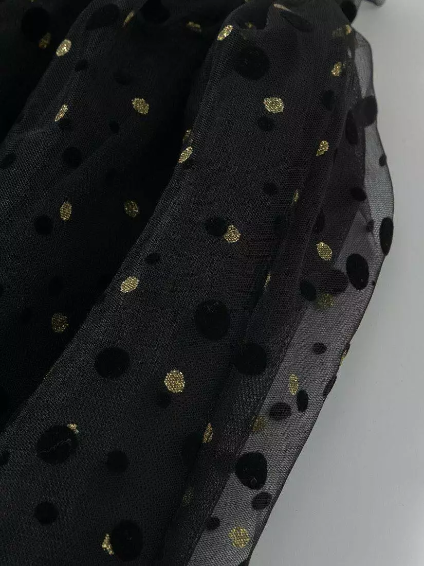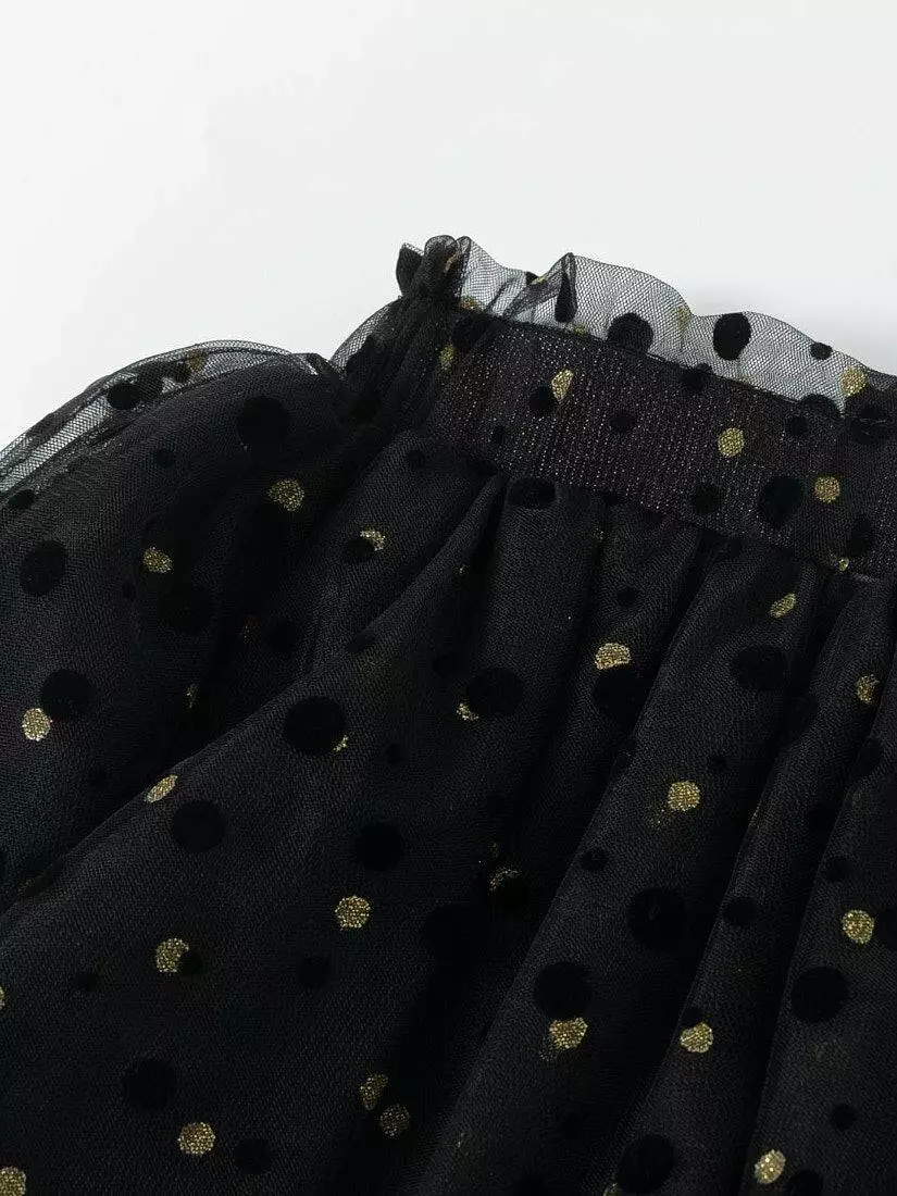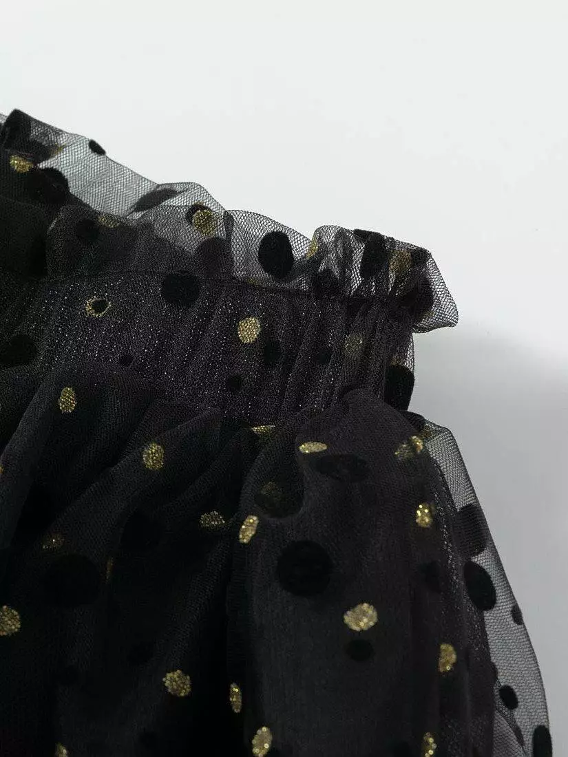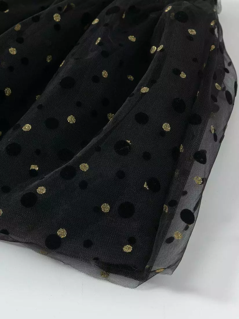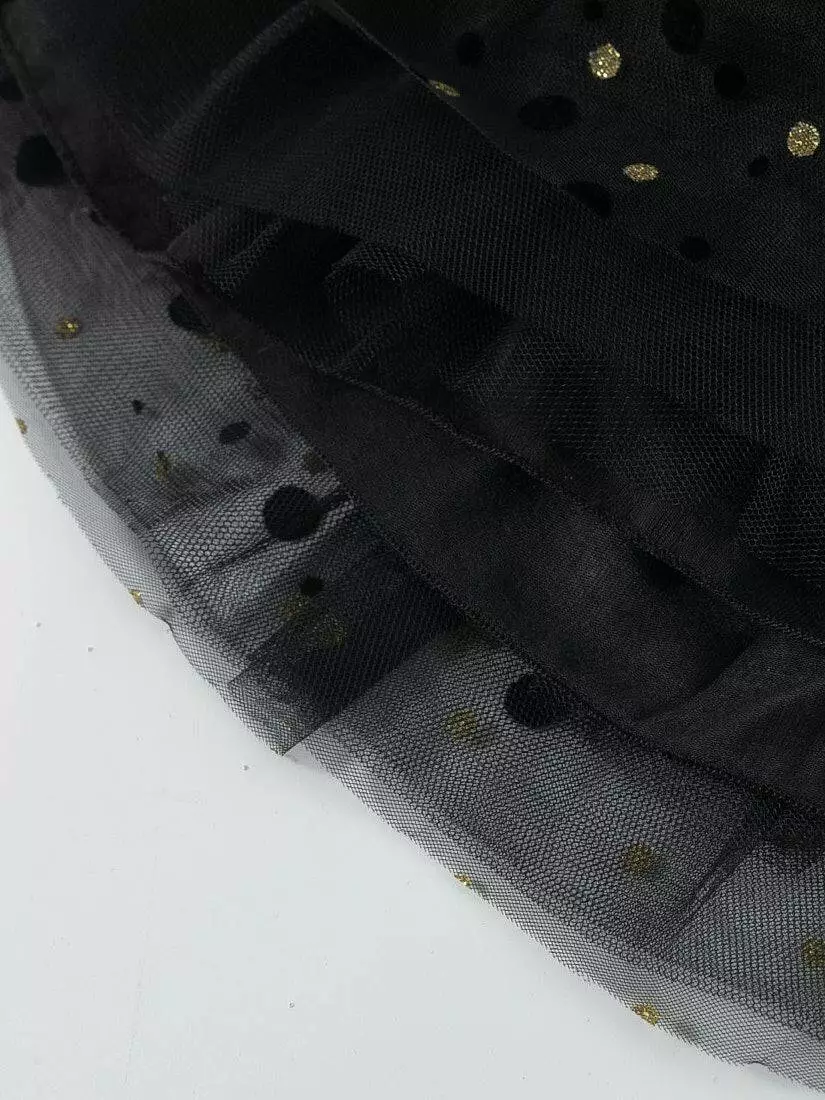 Зустрічайте нову колекцію - колаборація брендів YUMSTER і NEWNESS! Ідеальна спідниця для особливих випадків. Пишна та легка – це втілення стилю, витонченості та неповторності! Деталі моделі: спідниця чорного кольору. Пояс на резинці. Кілька ярусів фатина + непрозорий під’юбник чорного кольору. Декор - напилення золотого та чорного кольору у вигляді дрібного горошку. Розмірний ряд: на зріст від 98 см до 140 см