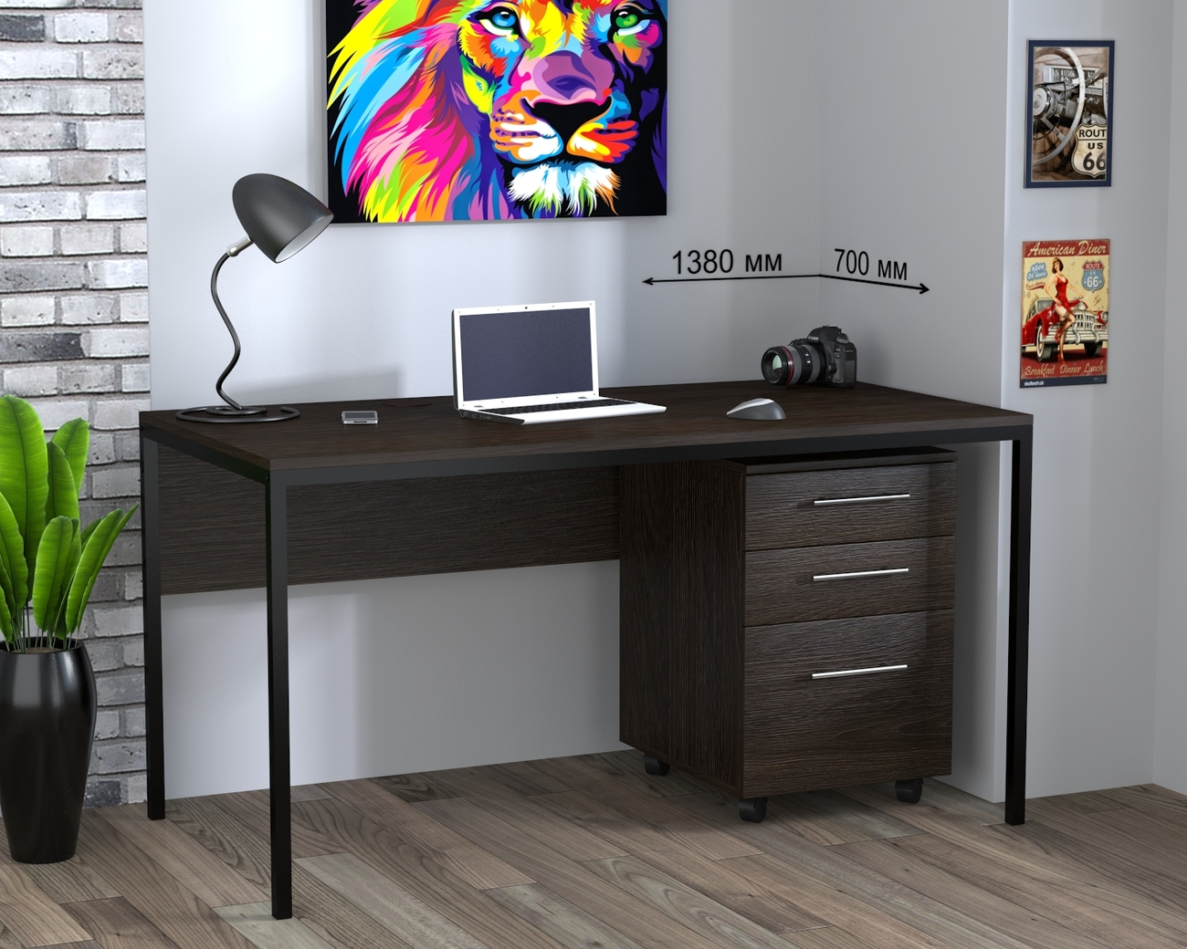 Каркас выполнен из металла, покрашенного в чёрный цвет. Ширина металлического профиля 25*25, толщина листа 1,4 мм. Столешница изготовлена из ЛДСП толщиной 16 мм с кромкой 2 мм.