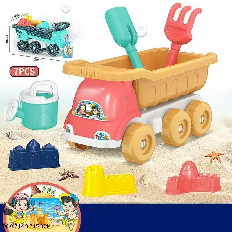 Пісочний набір 733-350 (54/2) 2 кольори, 7 елементів,розмір самоскида - 30х14х15см. лійка, лопатка, граблі, 3 формочки, у сітці, ВИДАЄТЬСЯ МІКС