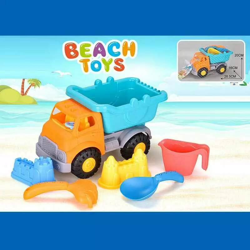 Пісочний набір JX 6857 (36/2) розмір самоскида - 28.5х16х20 см, лопатка, граблі, лійка, 2 формочки, в сітці