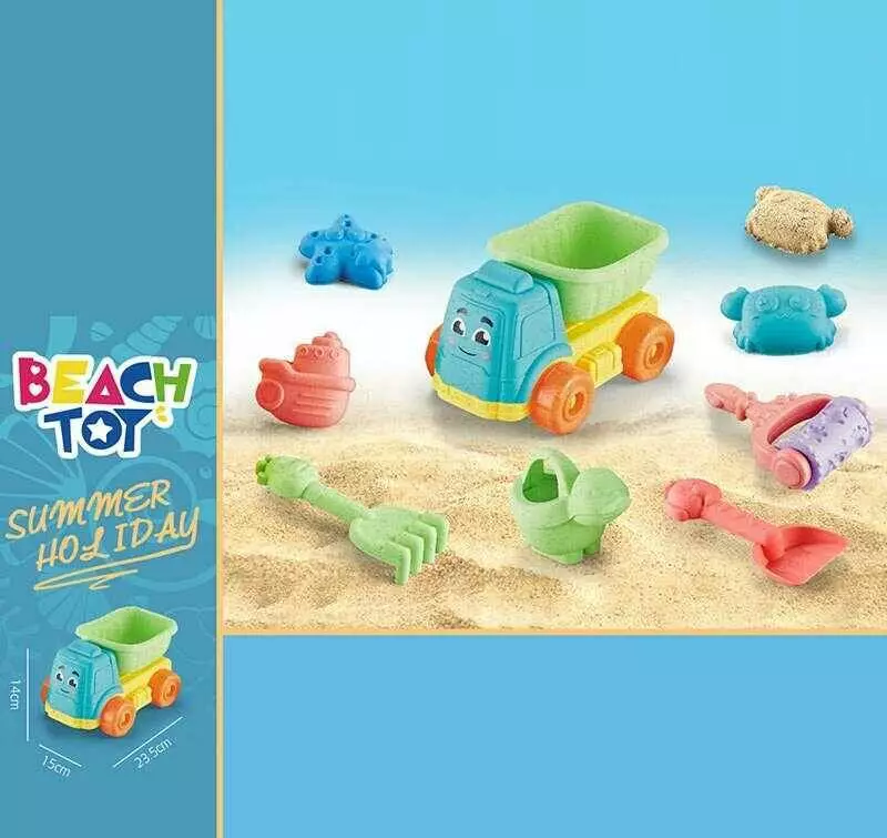 Пісочний набір RMT 366-38 (72/2) розмір самоскида - 21х15х12.5, лійка, граблі, лопатка, фігурний валик, 3 формочки, в сітці