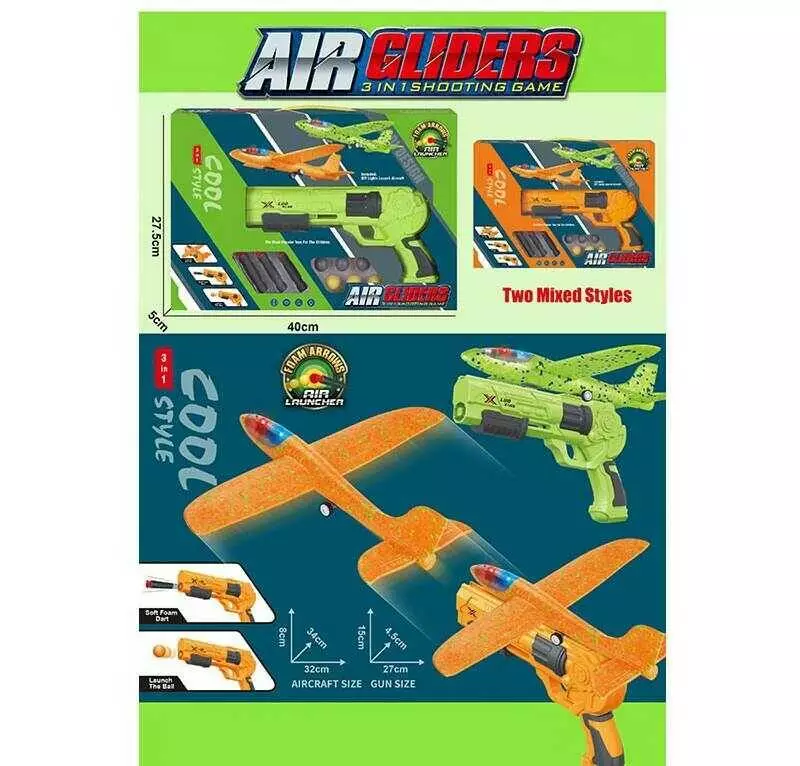 Пістолет із запускачем 949-104 (60/2) 2 кольори, механічний принцип, літачок з підсвічуванням, 6 куль, 3 м’які патрони з присосками, в коробці