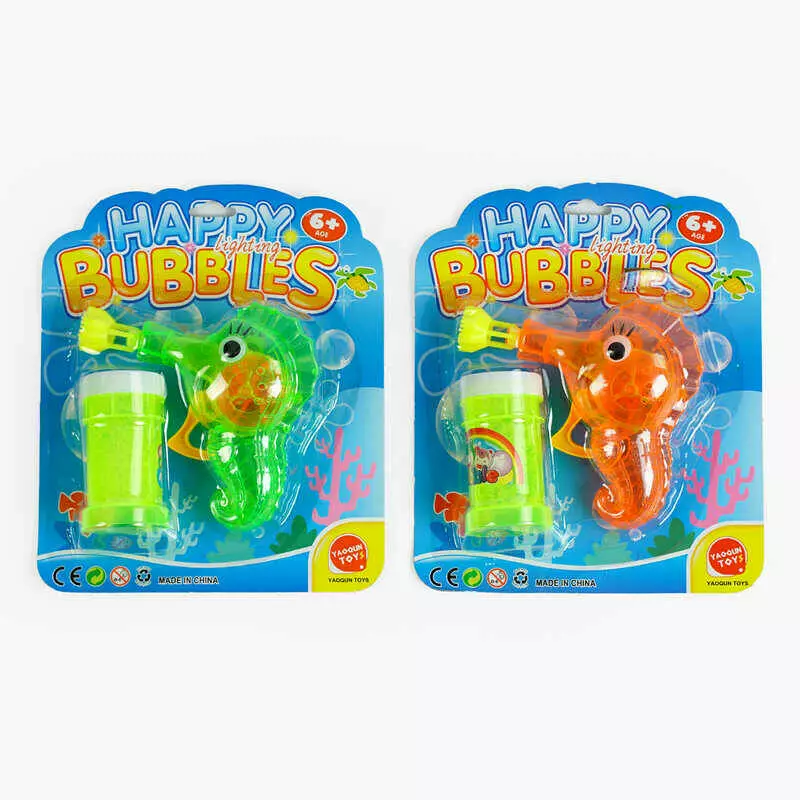 Пістолет з мильними бульбашками 9910 A (216/2) 2 кольори, механічний, прозорий корпус, пляшечка із мильною рідиною, на листі