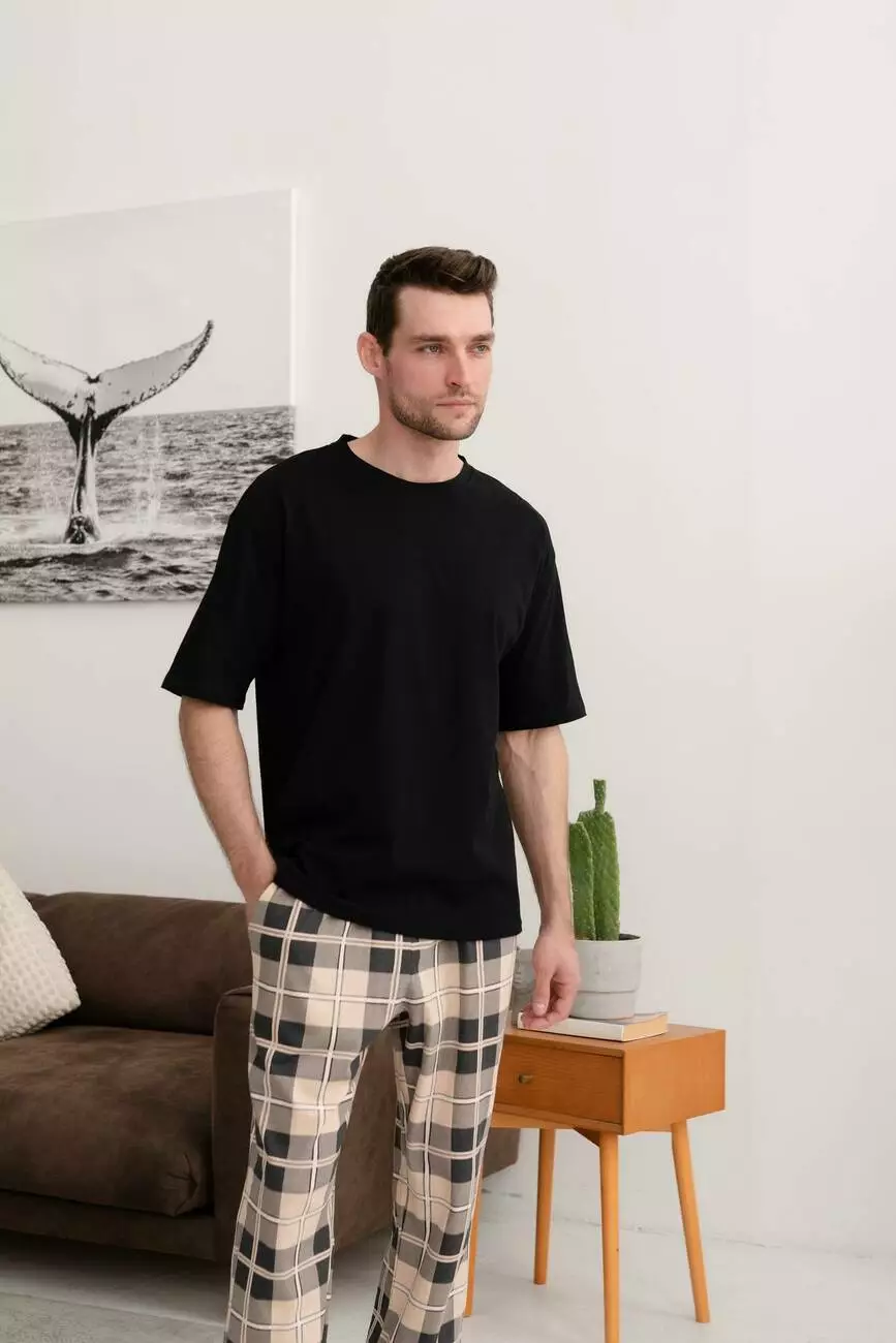 Футболка чорна, штани в клітку беж./темно-сірий.