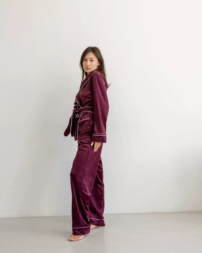 Комплект: Штани + Сорочка. Класичні штани вільного крою з резинкою на талії та кишенями. Сорочка з поясом на запах, всередині на зав'язках. Тканина: королівський плюш Туреччина на бавовняній основі Костюм оздоблений білим кантом, що додає піжамці вишуканості та виразності.