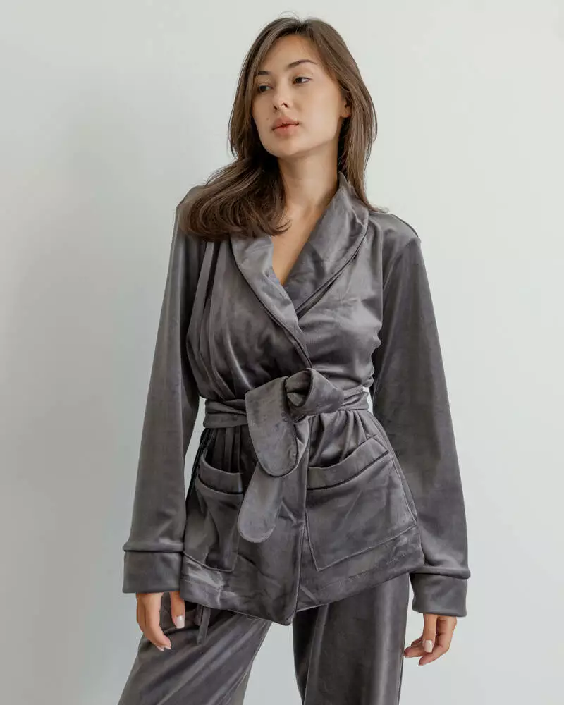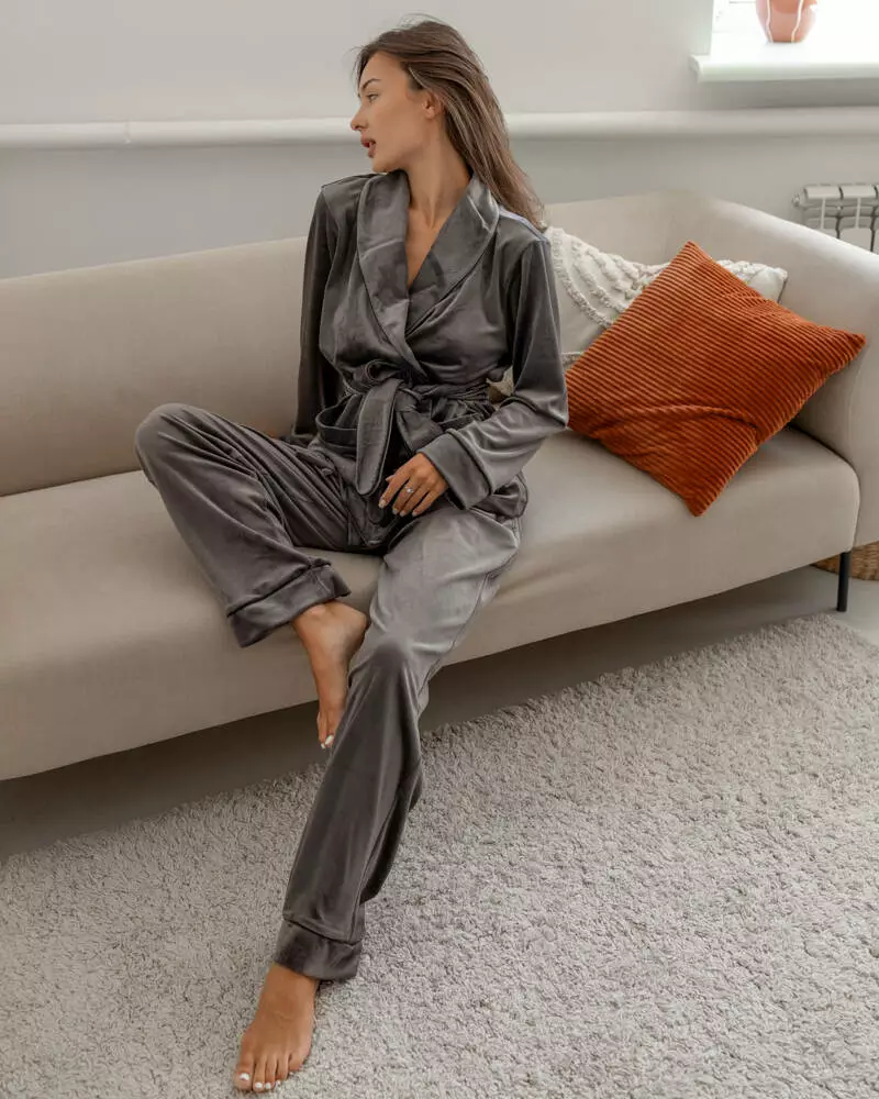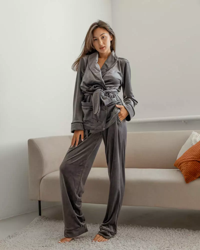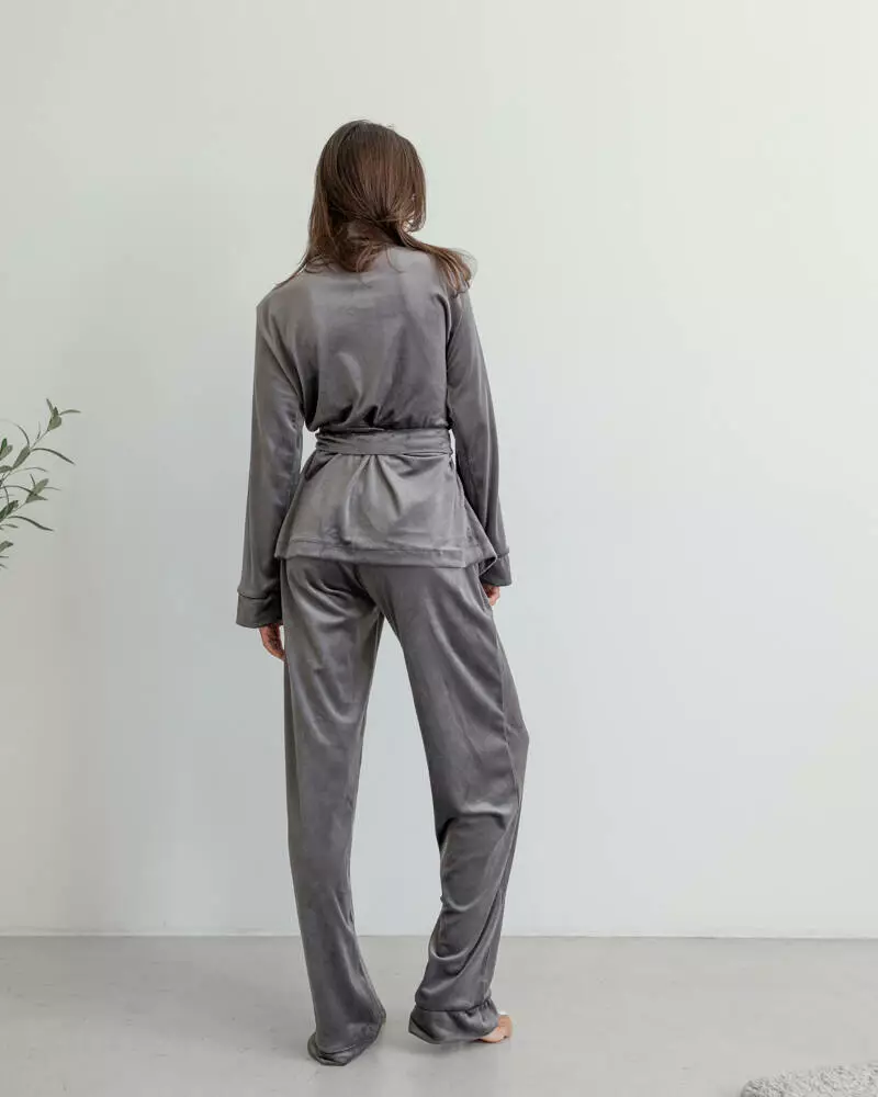 Комплект: Штани + Сорочка. Класичні штани вільного крою з резинкою на талії та кишенями. Сорочка з поясом на запах, всередині на зав'язках. Тканина: королівський плюш Туреччина на бавовняній основі Костюм оздоблений чорним кантом, що додає піжамці вишуканості та виразності.