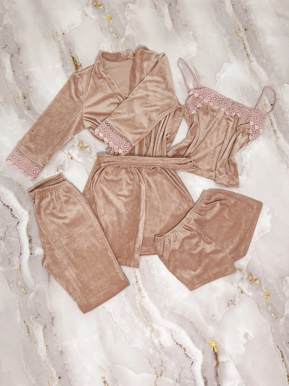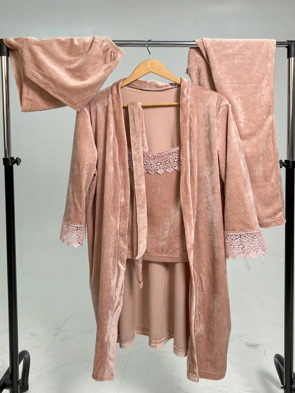 Жіноча піжама 4 в 1 ( штани, халат, майка та шорти ) відшита з міцної тканини, стійкої до механічних впливів, має хорошу теплоізоляцію. Відмінно пропускає повітря, не втрачає привабливий зовнішній вигляд і форму протягом тривалого часу. Одяг з велюру не потрібно прасувати, оскільки тканина не мнеться.