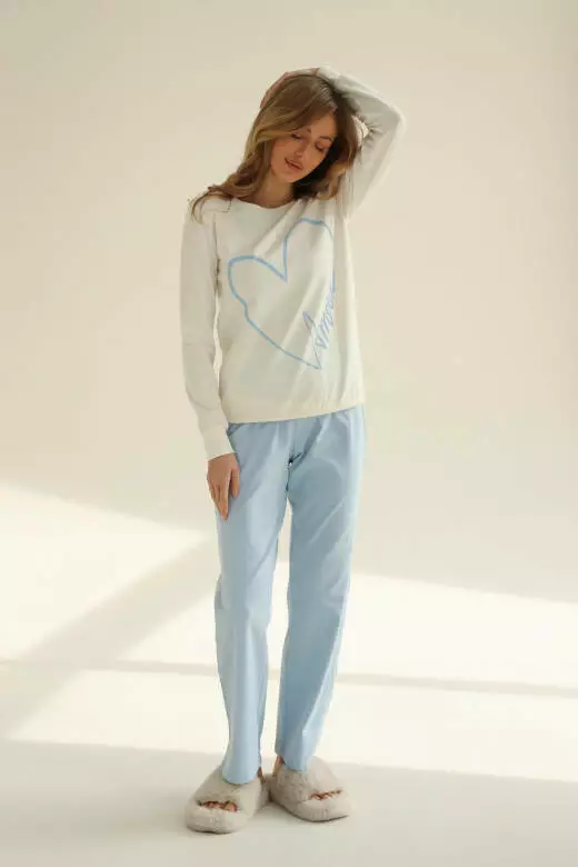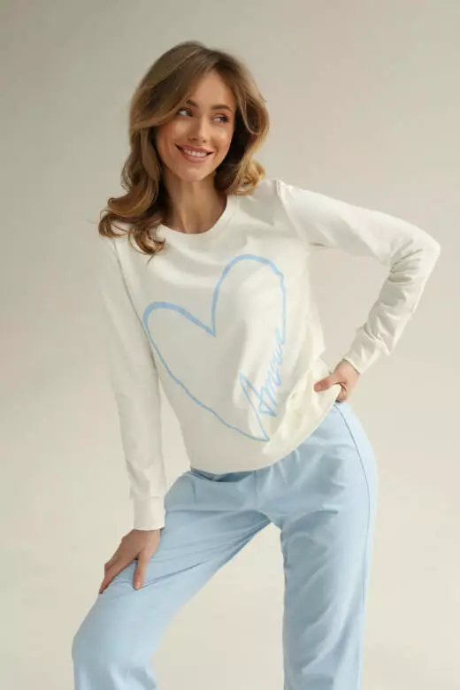 Піжама жіноча з колекції AMOUR - ідеальний вибір для вечірнього відпочинку вдома. Зроблена з м'якої бавовни, ця затишна набірна піжама з лонгслівом та штанами гарантує ваш комфорт і затишок. Принт AMOUR додає ніжності цій піжамі, роблячи кожен вечір особливим і затишним