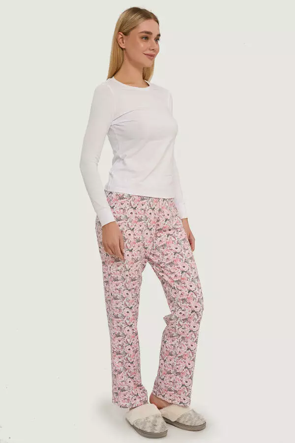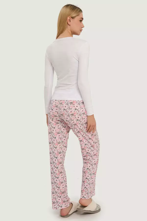 Лонгслів виконаний у мінімалістичному дизайні з довгими рукавами та округлим вирізом горловини, що надає комплекту елегантної простоти та зручності. Завдяки вільному крою, лонгслів не обмежує рухів, забезпечуючи комфорт і свободу під час сну або відпочинку вдома. Білий колір додає образу свіжості й чистоти, а також чудово поєднується з квітковим візерунком на штанах, створюючи ніжний і жіночний вигляд.