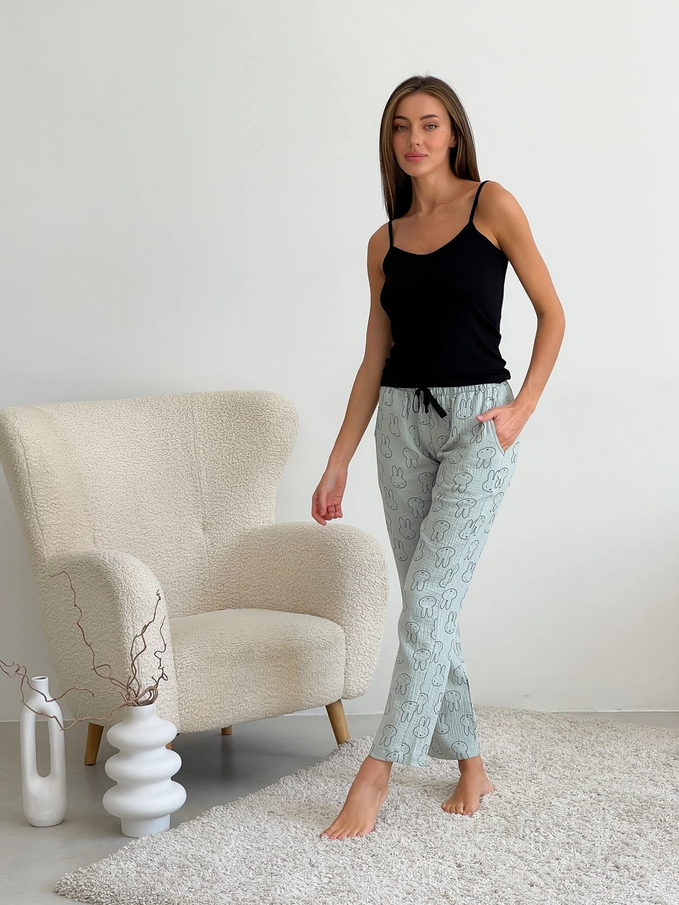М'які муслінові піжамні штани із зайчиками додадуть яскравості домашньому образу. У них можна комфортно проводити час вдома або піти спати. Натуральна тканина приємна та комфортна тілу.