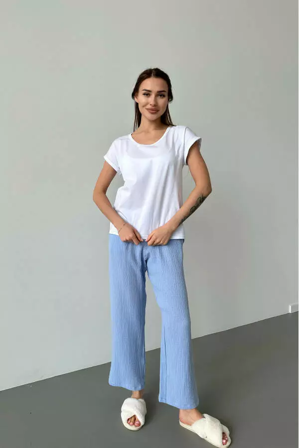 Піжамний комплект включає білу футболку і муслінові штани. Футболка