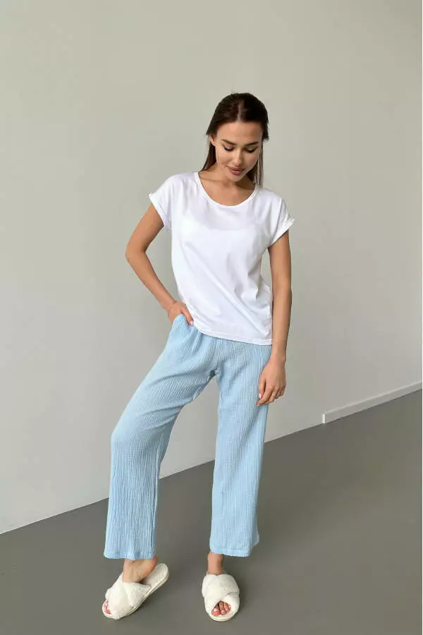 Піжамний комплект від брендового виробника German Volf включає білу футболку і муслінові штани. Футболка виконана з м'якого та приємного до тіла матеріалу, забезпечуючи комфорт та свободу рухів. Футболка базова може бути носима як удома, так і на прогулянці. Штани з мусліну мають легкість і добре дихають, що робить їх відмінним варіантом для сну або відпочинку. Цей піжамний комплект поєднує стиль, зручність і якість, які подарують вам приємні моменти відпочинку і комфорту.