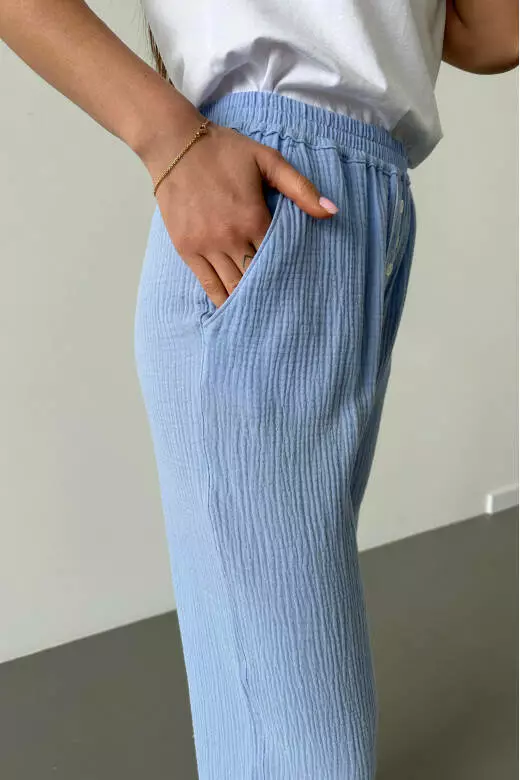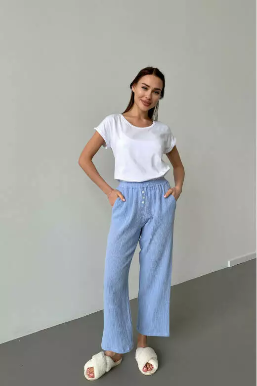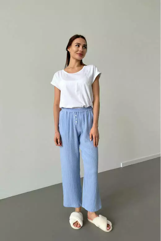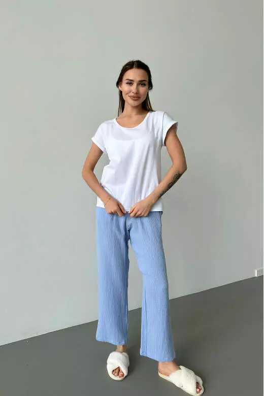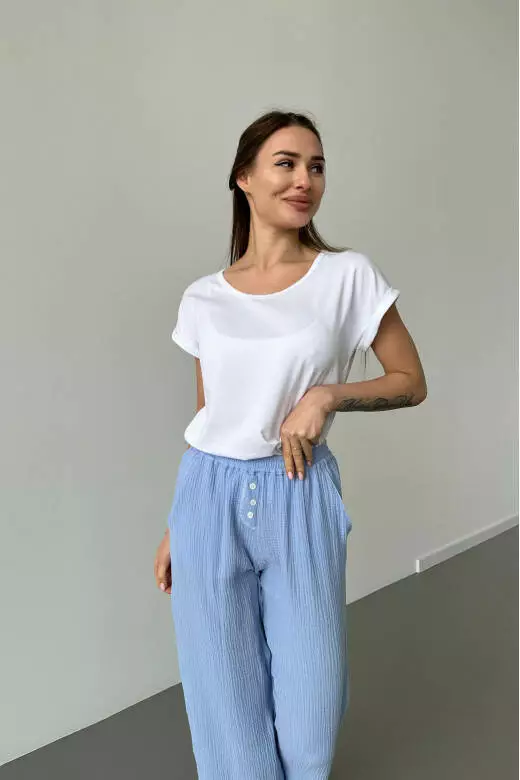 Піжамний комплект включає білу футболку і муслінові штани. Футболка виконана з м'якого та приємного до тіла матеріалу, забезпечуючи комфорт та свободу рухів. Футболка базова може бути носима як вдома, так і на прогулянці. Штани з мусліну мають легкість і добре дихають, що робить їх відмінним варіантом для сну або відпочинку. Цей піжамний комплект поєднує в собі стиль, зручність та якість, які подарують вам приємні моменти відпочинку та комфорту