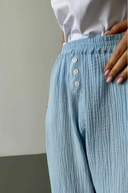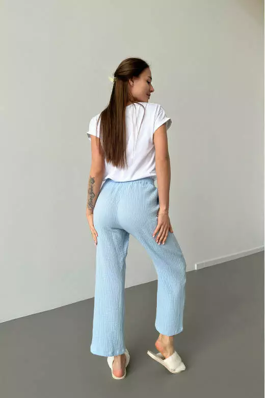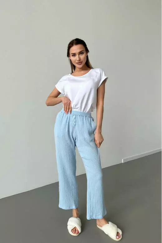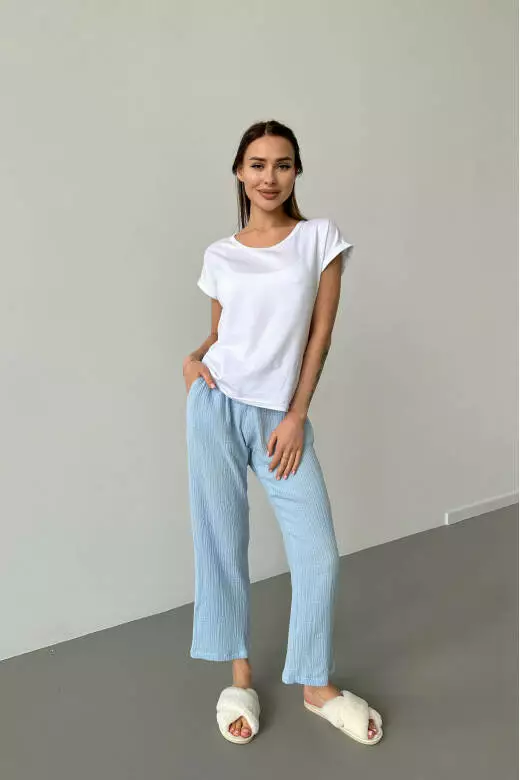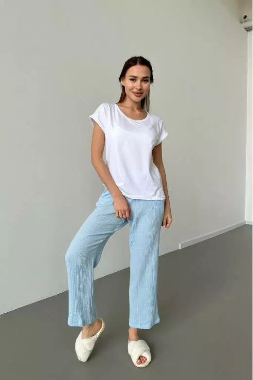Піжамний комплект включає білу футболку і муслінові штани. Футболка виконана з м'якого та приємного до тіла матеріалу, забезпечуючи комфорт та свободу рухів. Футболка базова може бути носима як вдома, так і на прогулянці. Штани з мусліну мають легкість і добре дихають, що робить їх відмінним варіантом для сну або відпочинку. Цей піжамний комплект поєднує в собі стиль, зручність та якість, які подарують вам приємні моменти відпочинку та комфорту