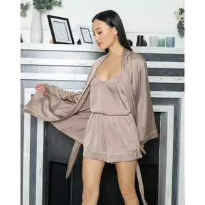 Піжамний костюм виконаний із якісного шовку Армані. Комплект: майка на лямках, зручний халат з поясом, штани вільного крою з кишенями та шорти. Піжама дуже зручна та універсальна. Можна носити в літню пору із шортами та під час холодів зі штанами, окремо добре виглядає халат з широкими рукавами.